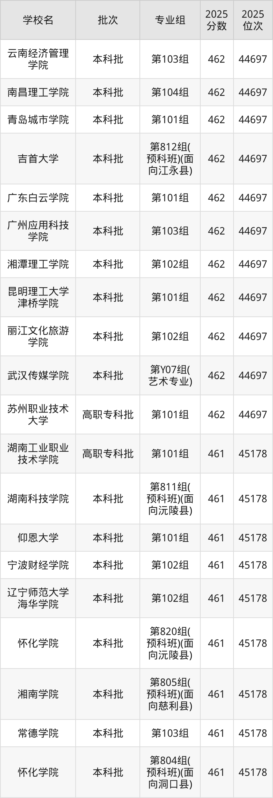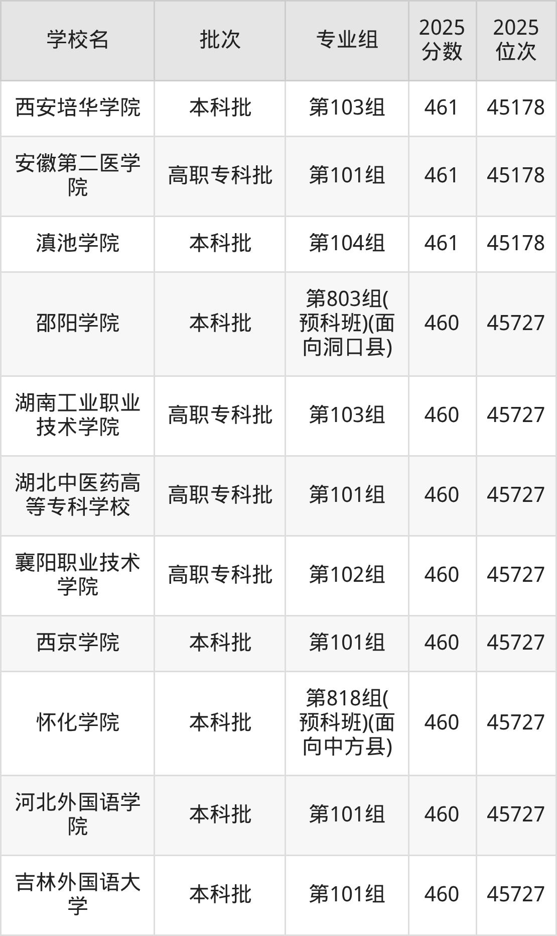 2025年湖南高考历史类460分(45179名~45727名)能上的大学有河北外国语学院第101组、吉林外国语大学第101组、邵阳学院第803组(预科班)(面向洞口县)、怀化学院第818组(预科班)(面向中方县)等。