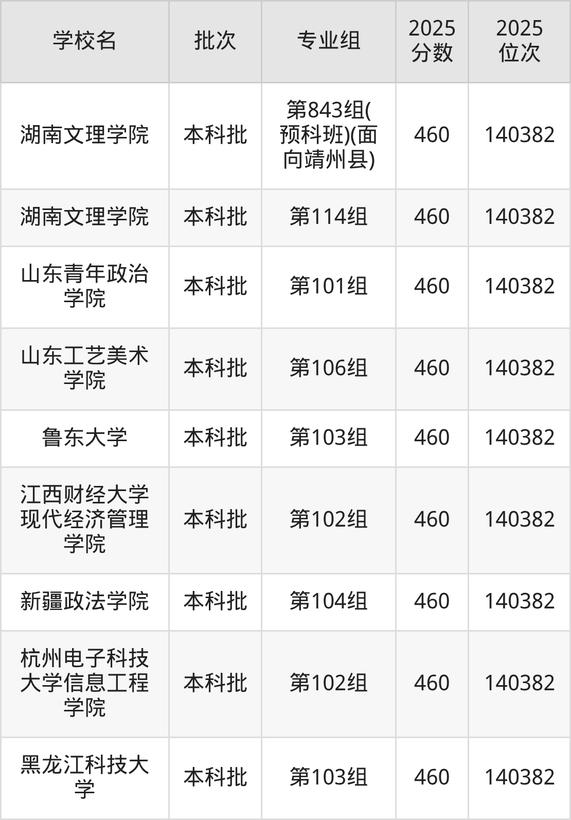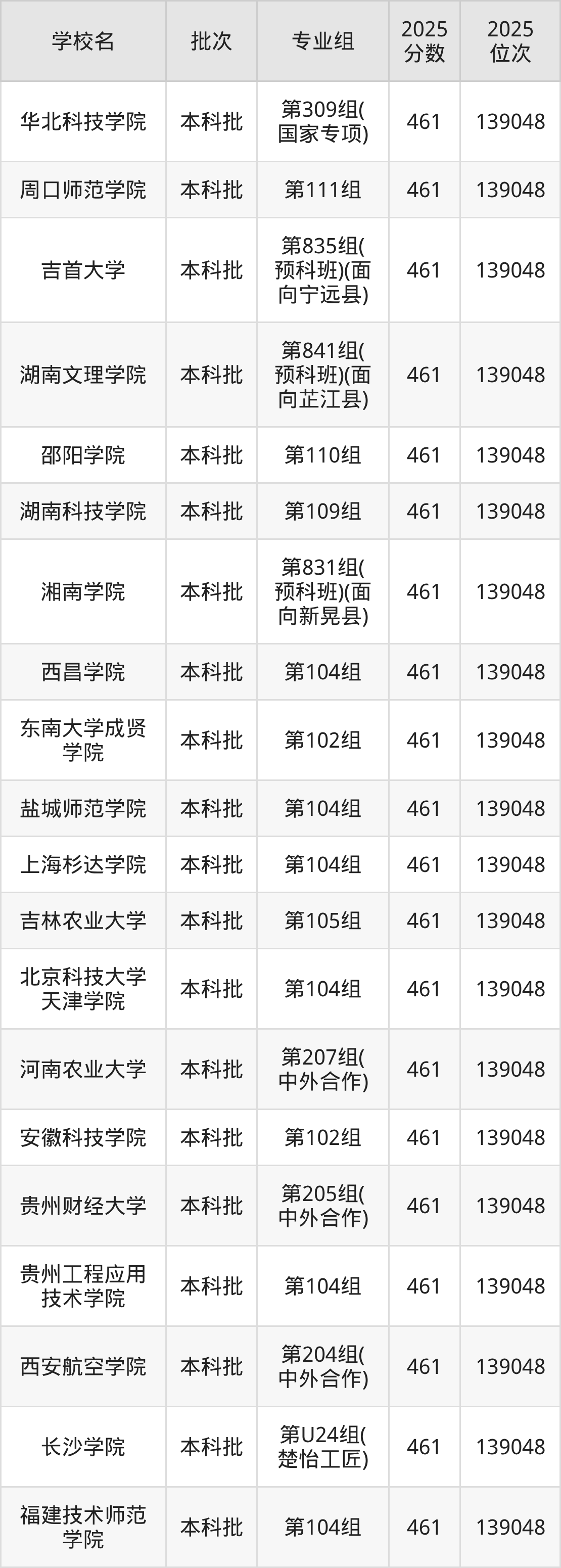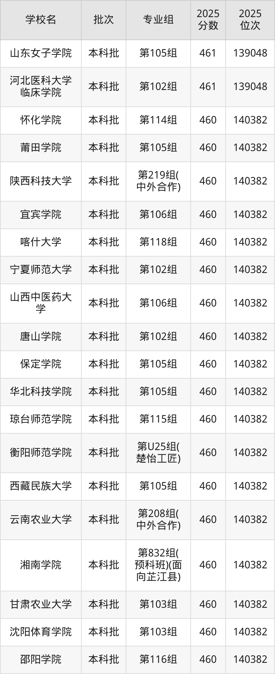 2025年湖南高考物理类460分(139049名~140382名)能上的大学有华北科技学院第105组、保定学院第105组、唐山学院第102组、山西中医药大学第106组等。