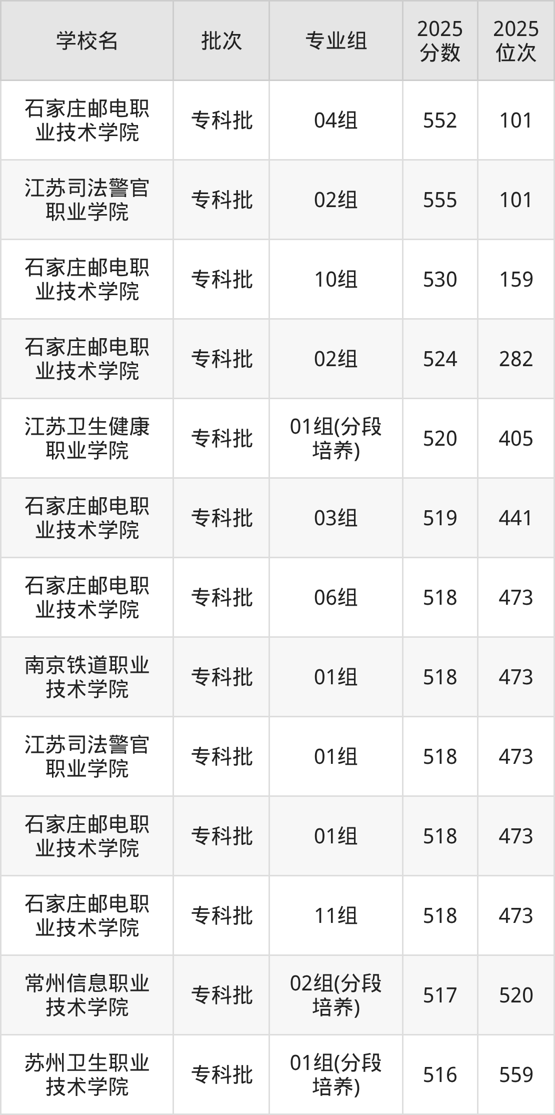 另外录取位次低于该区间(较稳妥)的有江苏司法警官职业学院05组(373名)、江苏司法警官职业学院04组(1195名)等;录取位次高于该区间(可冲)的有甘肃中医药大学07组(105341名)、南京特殊教育师范学院10组(105341名)等。
