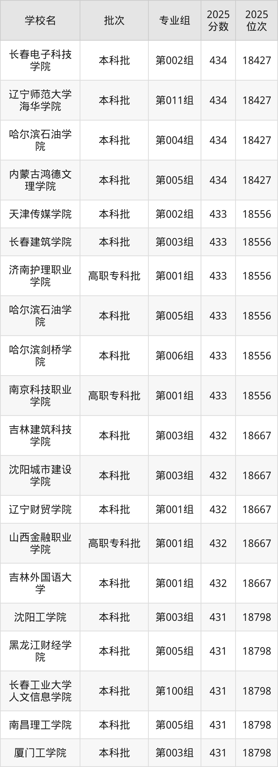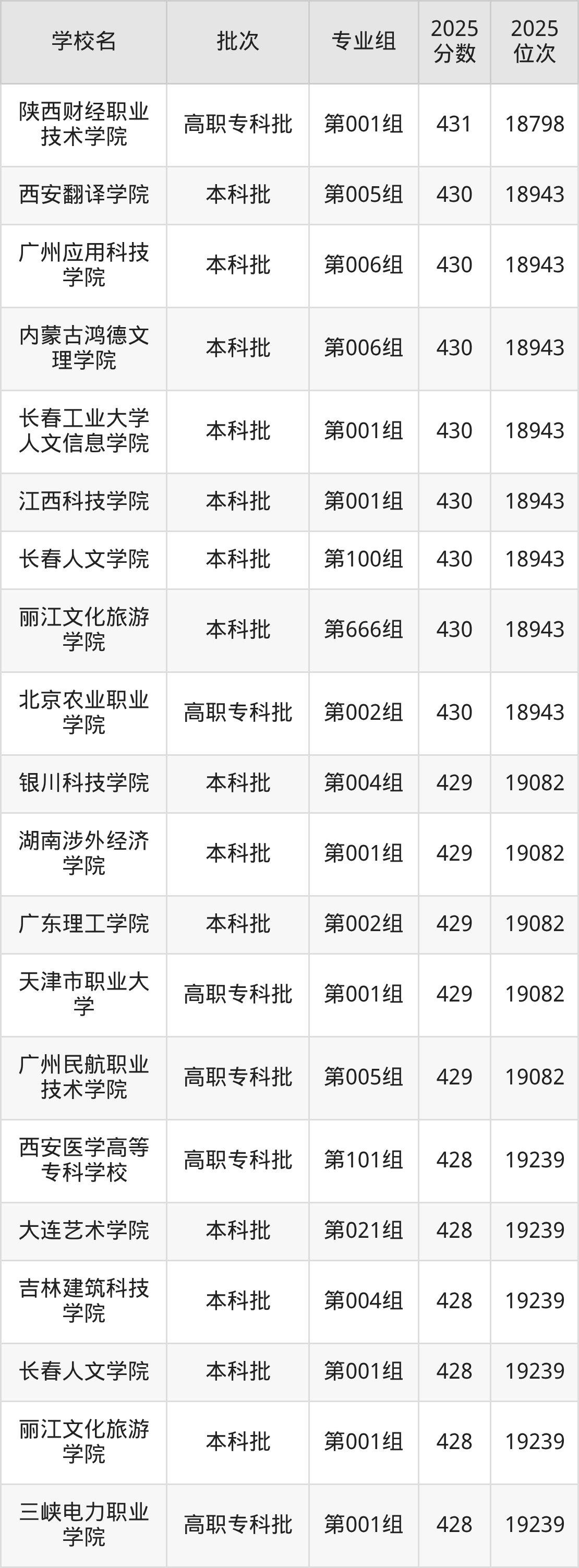 2025年内蒙古高考历史类430分(18799名~18943名)能上的大学有江西科技学院第001组、丽江文化旅游学院第666组、广州应用科技学院第006组、内蒙古鸿德文理学院第006组等。