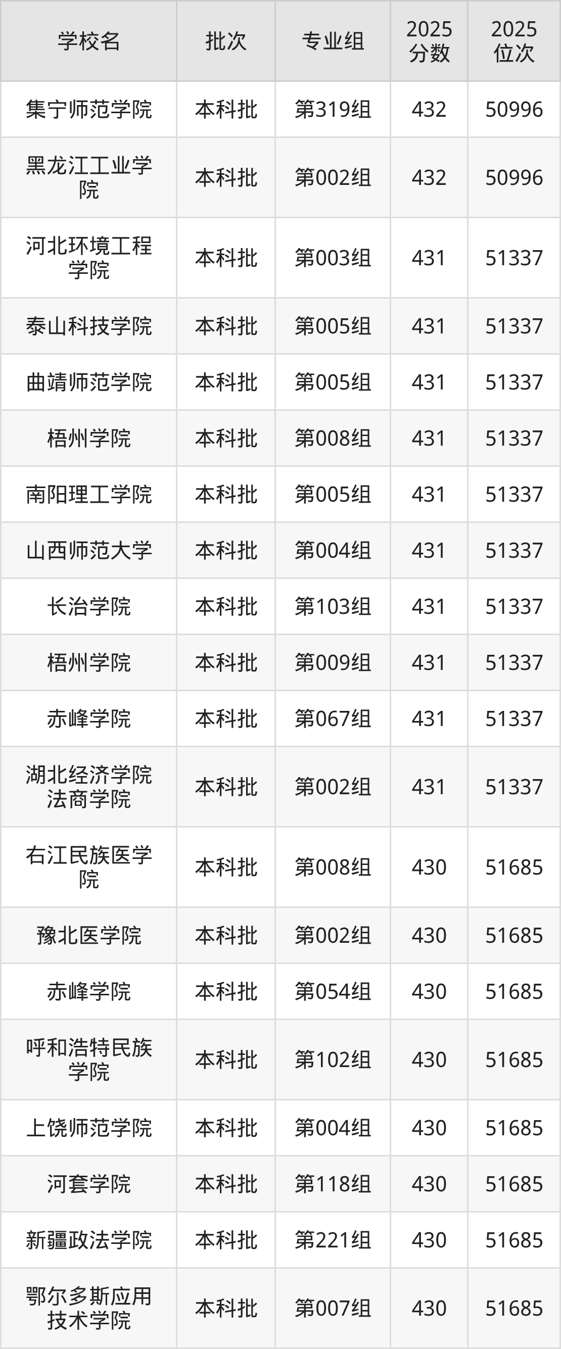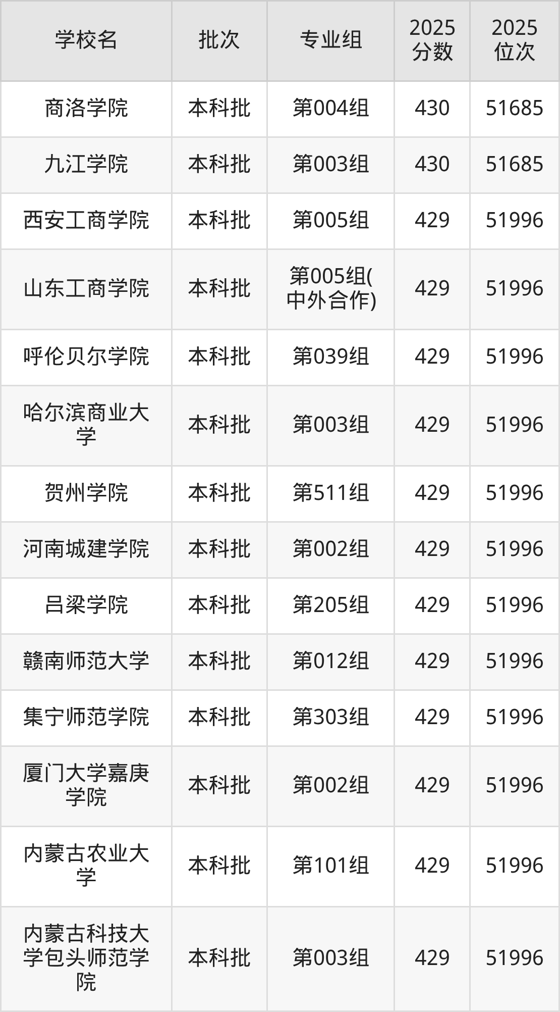2025年内蒙古高考物理类430分(51338名~51685名)能上的大学有呼和浩特民族学院第102组、右江民族医学院第008组、鄂尔多斯应用技术学院第007组、商洛学院第004组等。