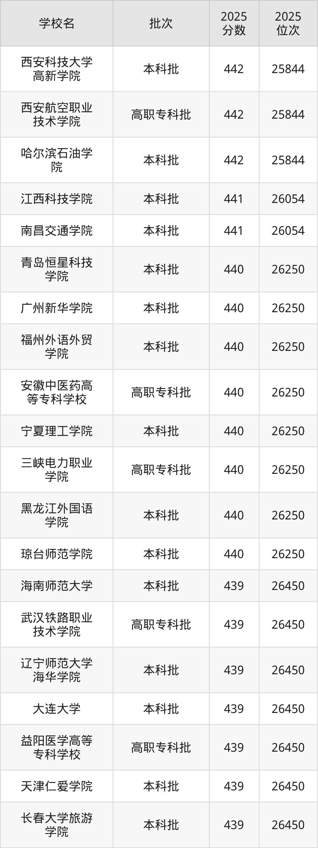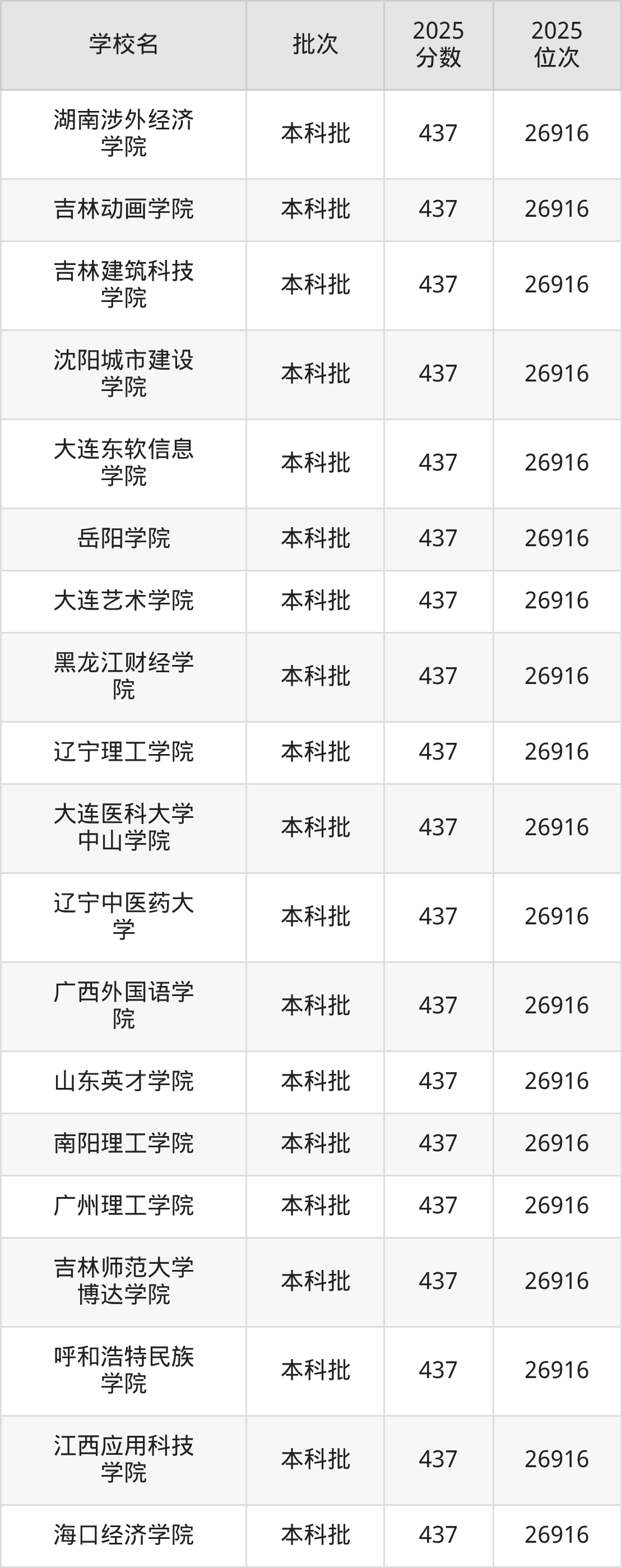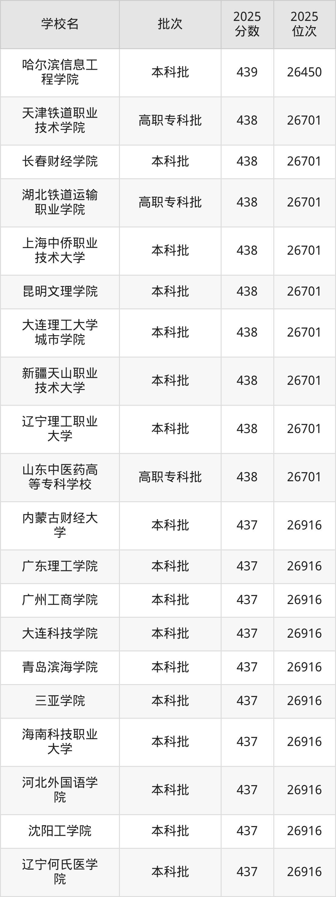 2025年辽宁高考历史类439分(26251名~26450名)能上的大学有辽宁师范大学海华学院、海南师范大学、哈尔滨信息工程学院、武汉铁路职业技术学院等。