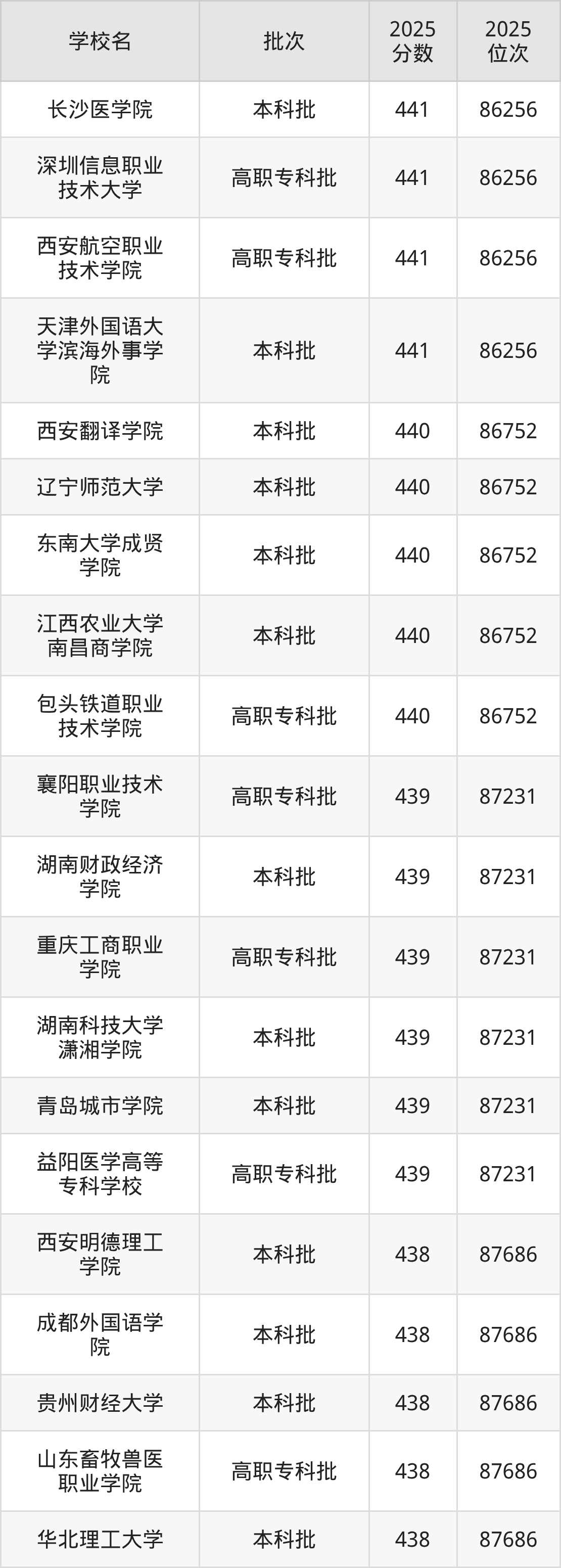 2025年辽宁高考物理类439分(86753名~87231名)能上的大学有益阳医学高等专科学校、青岛城市学院、湖南科技大学潇湘学院、湖南财政经济学院等。