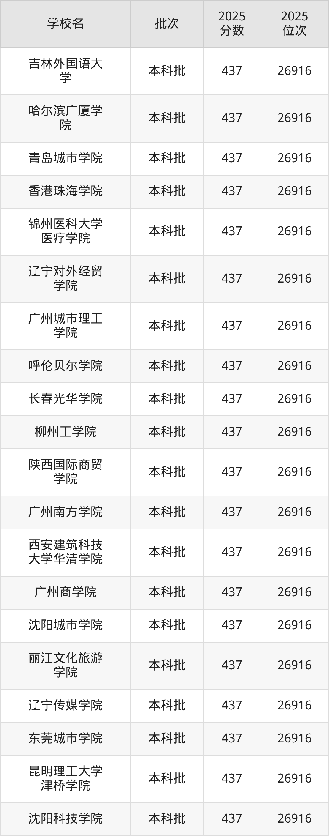 另外录取位次低于该区间(较稳妥)的有辽宁理工职业大学(26701名)、长春财经学院(26701名)等;录取位次高于该区间(可冲)的有福州外语外贸学院(26250名)、宁夏理工学院(26250名)等。