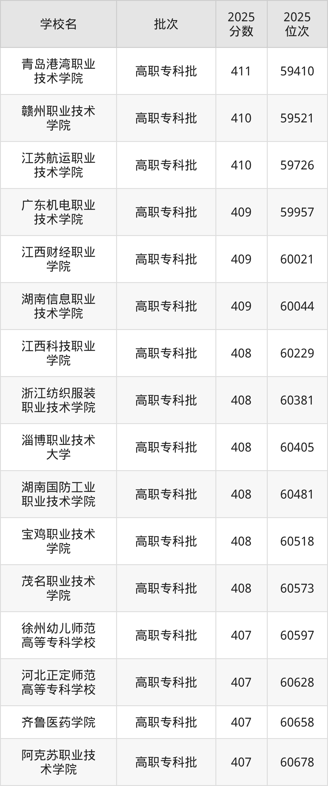 2025年贵州高考历史类409分(59810名~60179名)能上的大学有广东机电职业技术学院、江西财经职业学院、湖南信息职业技术学院。