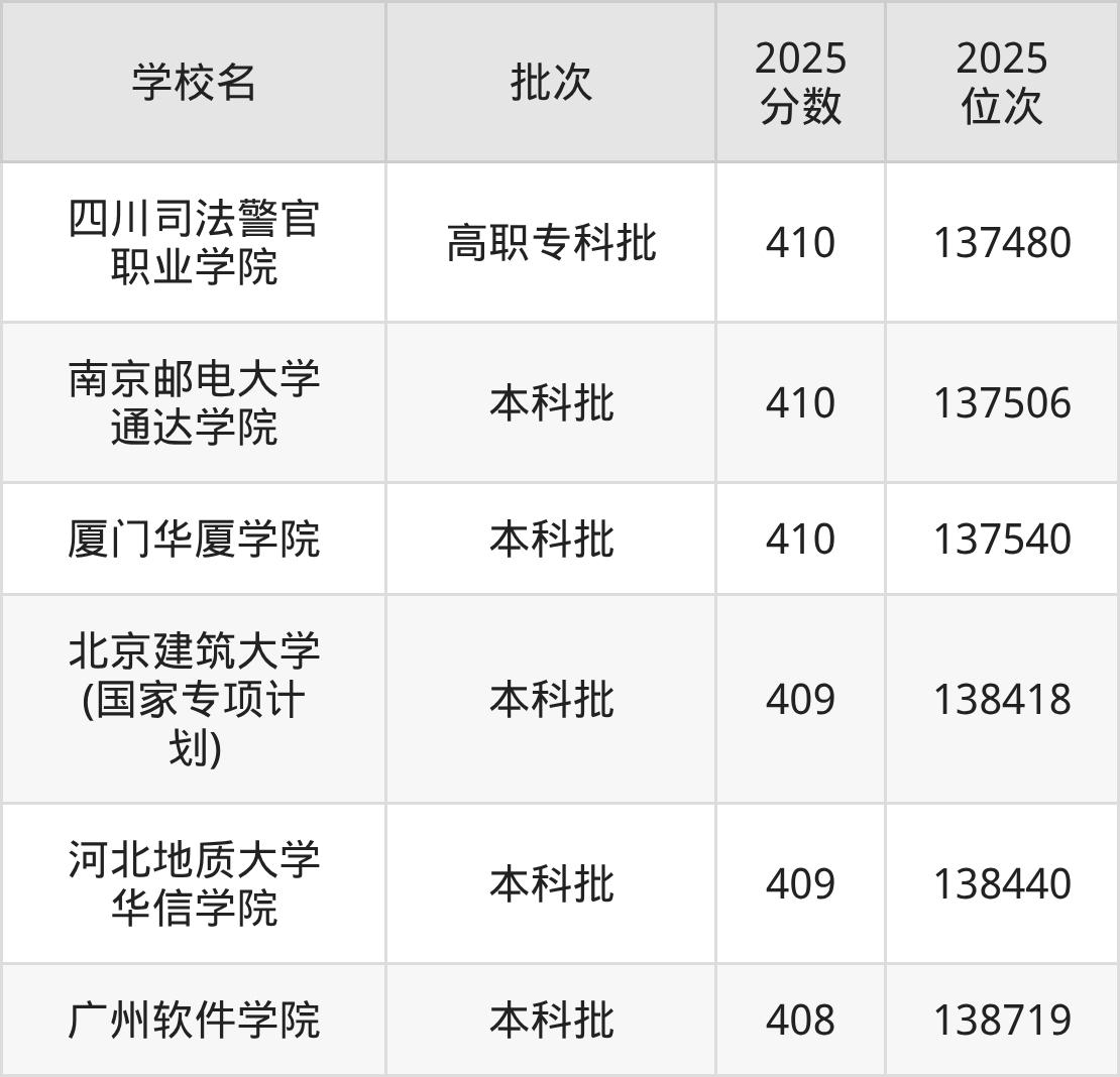 2025年贵州高考物理类409分(137746名~138665名)能上的大学有河北地质大学华信学院、北京建筑大学(国家专项计划)。