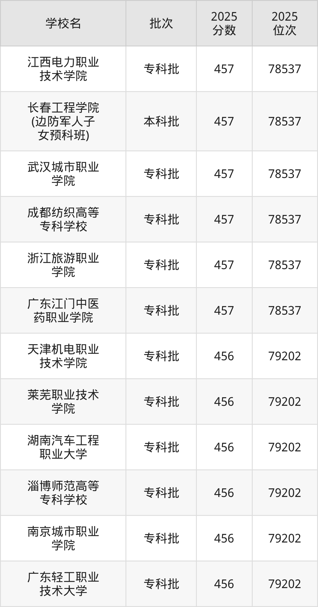 2025年河北高考历史类456分(78538名~79202名)能上的大学有天津机电职业技术学院、湖南汽车工程职业大学、南京城市职业学院、广东轻工职业技术大学等。