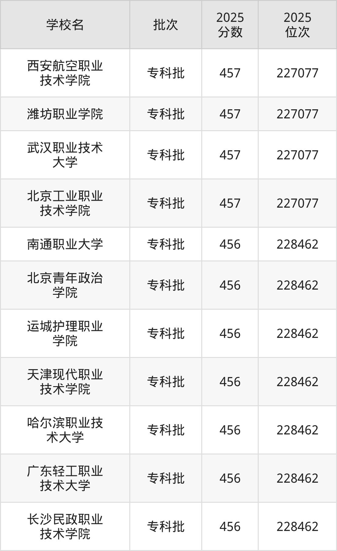 2025年河北高考物理类456分(227078名~228462名)能上的大学有长沙民政职业技术学院、运城护理职业学院、南通职业大学、哈尔滨职业技术大学等。