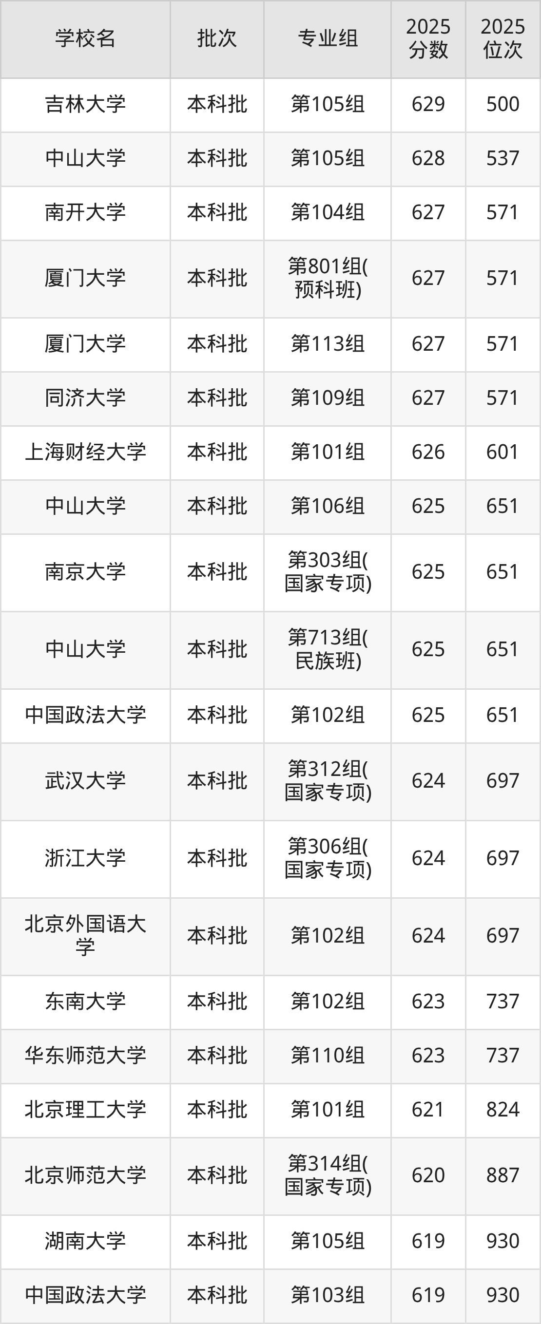 2025年湖南高考历史类629分(456名~500名)能上的大学有北京航空航天大学第102组、吉林大学第105组、武汉大学第105组。