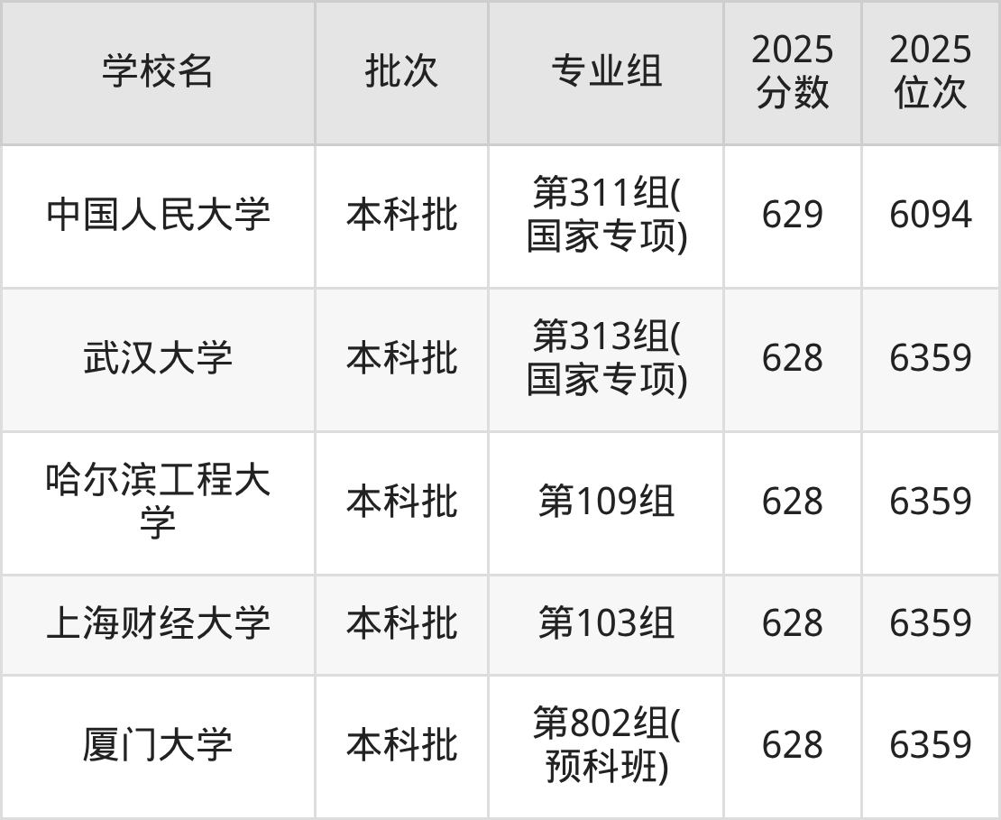 2025年湖南高考物理类629分(5843名~6094名)能上的大学有中国人民大学第311组(国家专项)、北京邮电大学第308组(国家专项)、北京理工大学第205组(中外合作)、吉林大学第107组等。