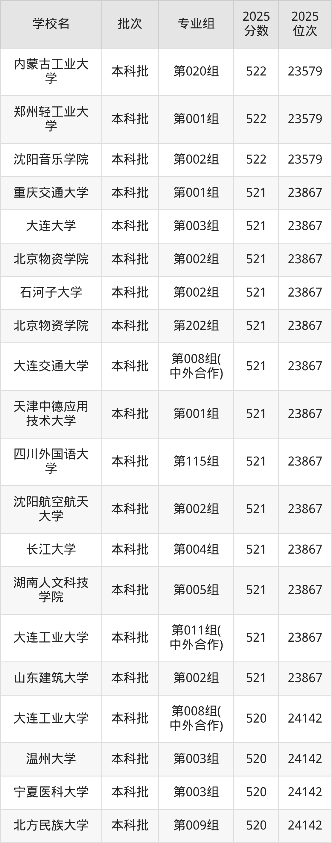 2025年内蒙古高考物理类521分(23580名~23867名)能上的大学有山东建筑大学第002组、大连工业大学第011组(中外合作)、湖南人文科技学院第005组、长江大学第004组等。