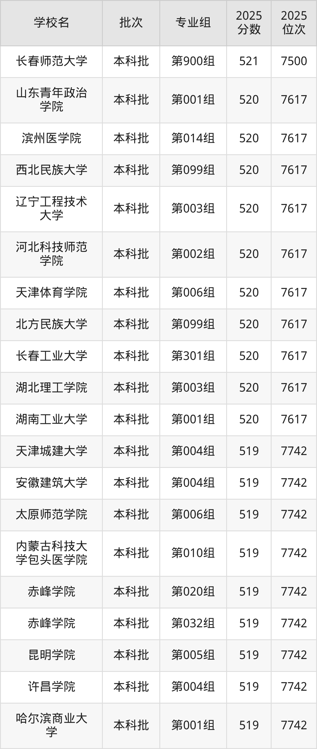 2025年内蒙古高考历史类521分(7391名~7500名)能上的大学有唐山学院第002组、齐齐哈尔大学第006组、内蒙古工业大学第436组、长春师范大学第900组等。