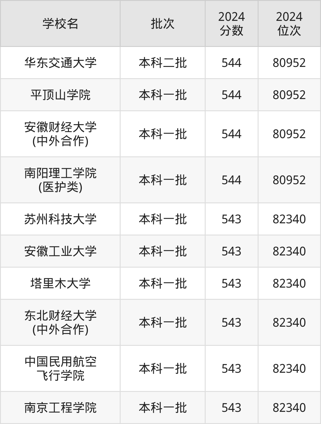 2024年河南高考理科543分(80953名~82340名)能上的大学有安徽工业大学、南京工程学院、中国民用航空飞行学院、苏州科技大学等。