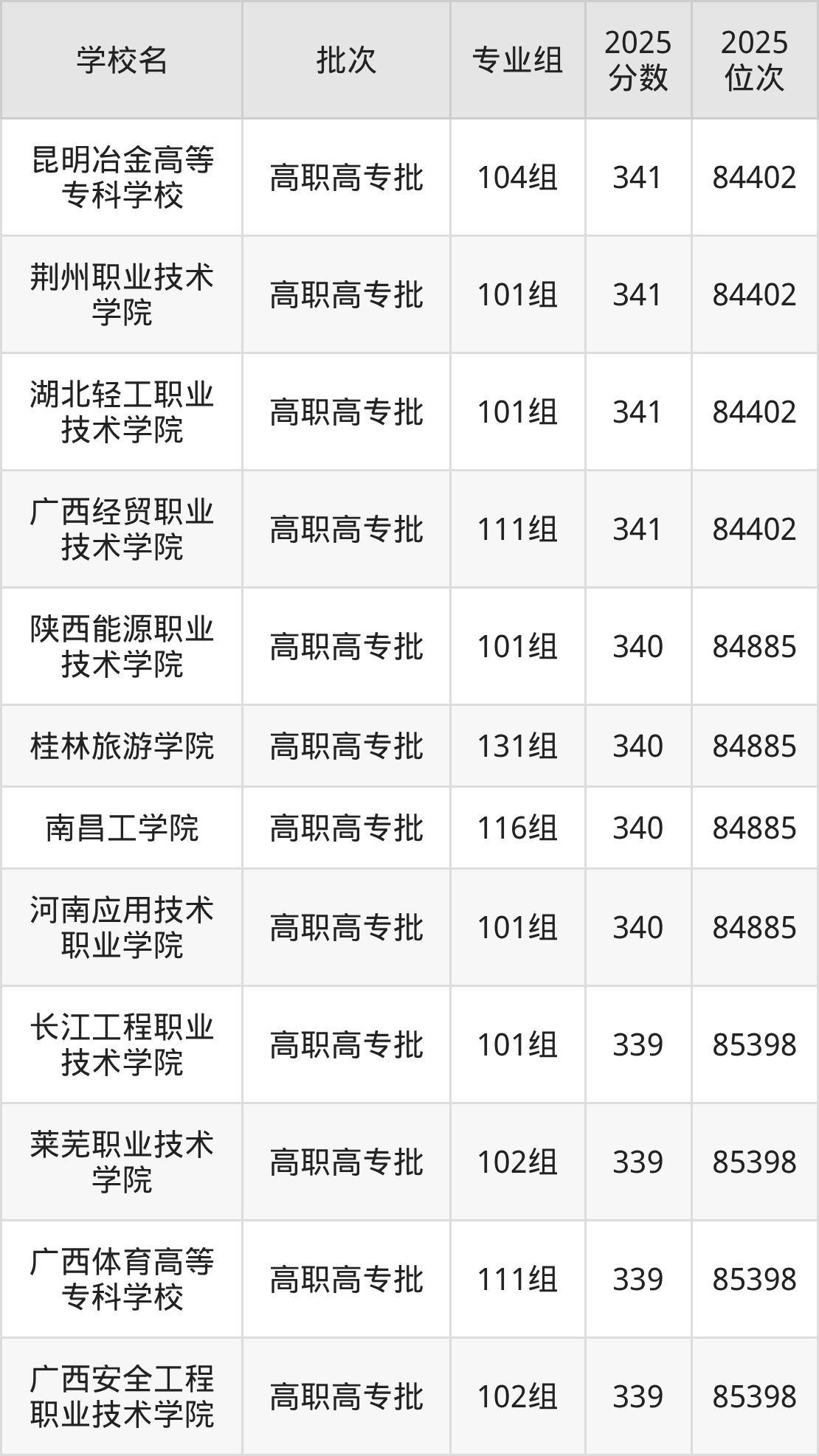 2025年广西高考历史类339分(84886名~85398名)能上的大学有广西体育高等专科学校111组、莱芜职业技术学院102组、长江工程职业技术学院101组、广西安全工程职业技术学院102组。