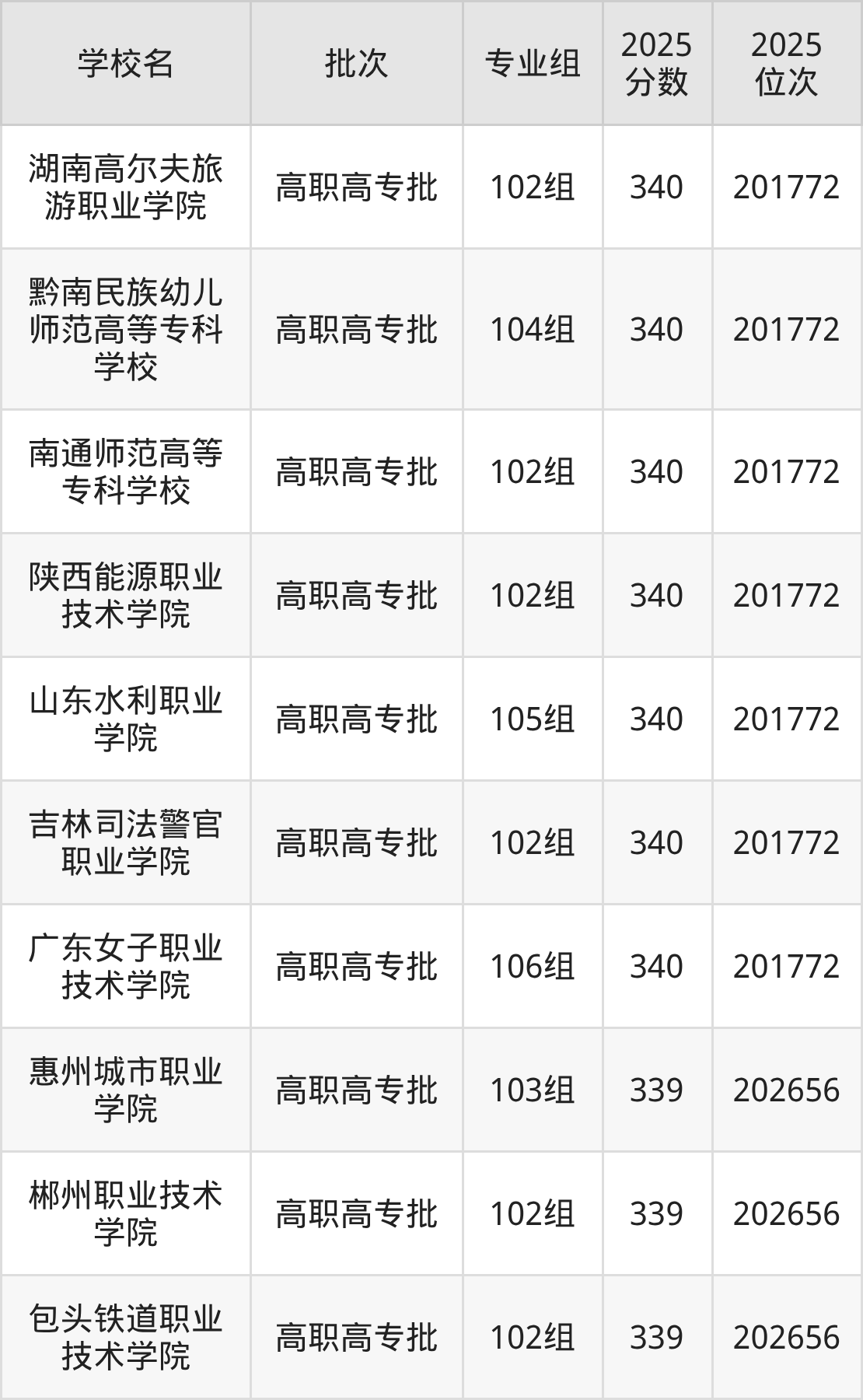 2025年广西高考物理类339分(201773名~202656名)能上的大学有郴州职业技术学院102组、包头铁道职业技术学院102组、惠州城市职业学院103组。