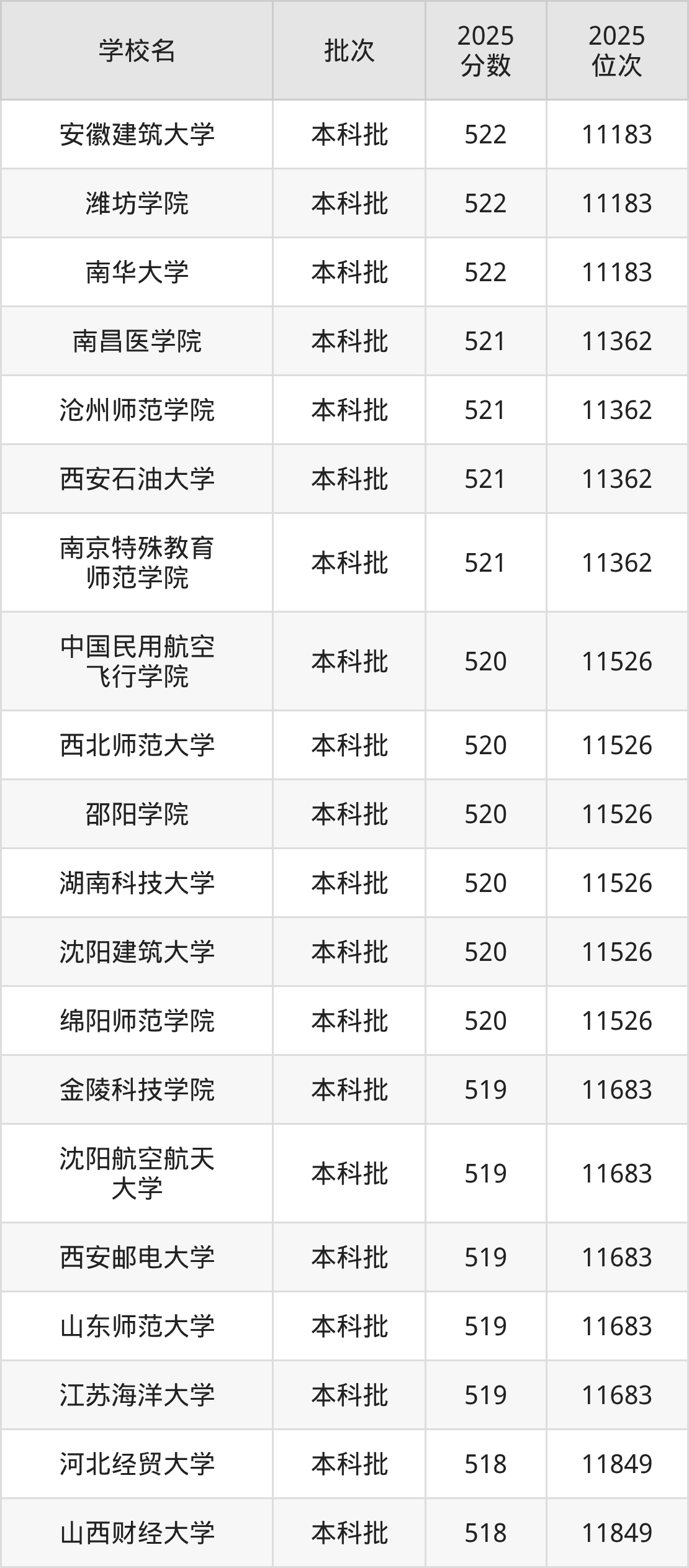 2025年辽宁高考历史类519分(11527名~11683名)能上的大学有江苏海洋大学、沈阳航空航天大学、西安邮电大学、山东师范大学等。