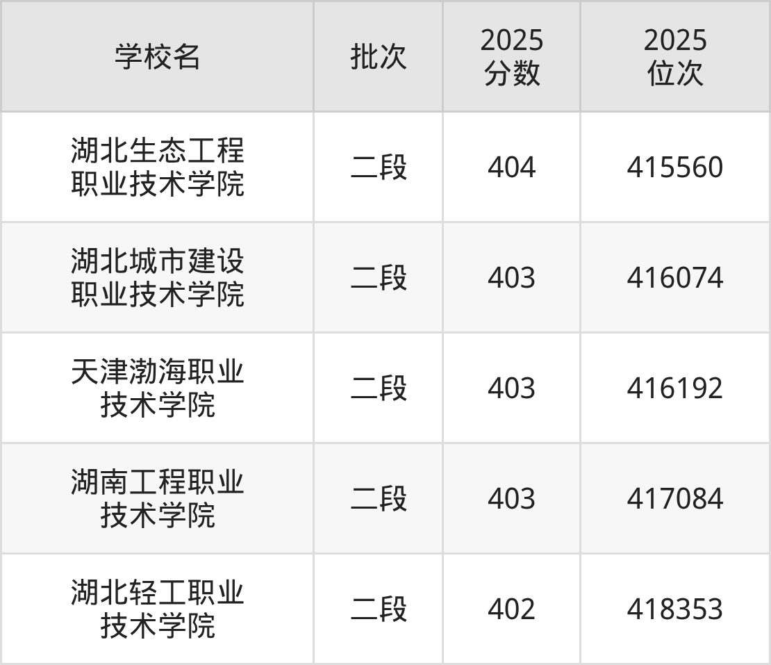 2025年山东高考403分(415914名~418005名)能上的大学有湖北城市建设职业技术学院、湖南工程职业技术学院、天津渤海职业技术学院。