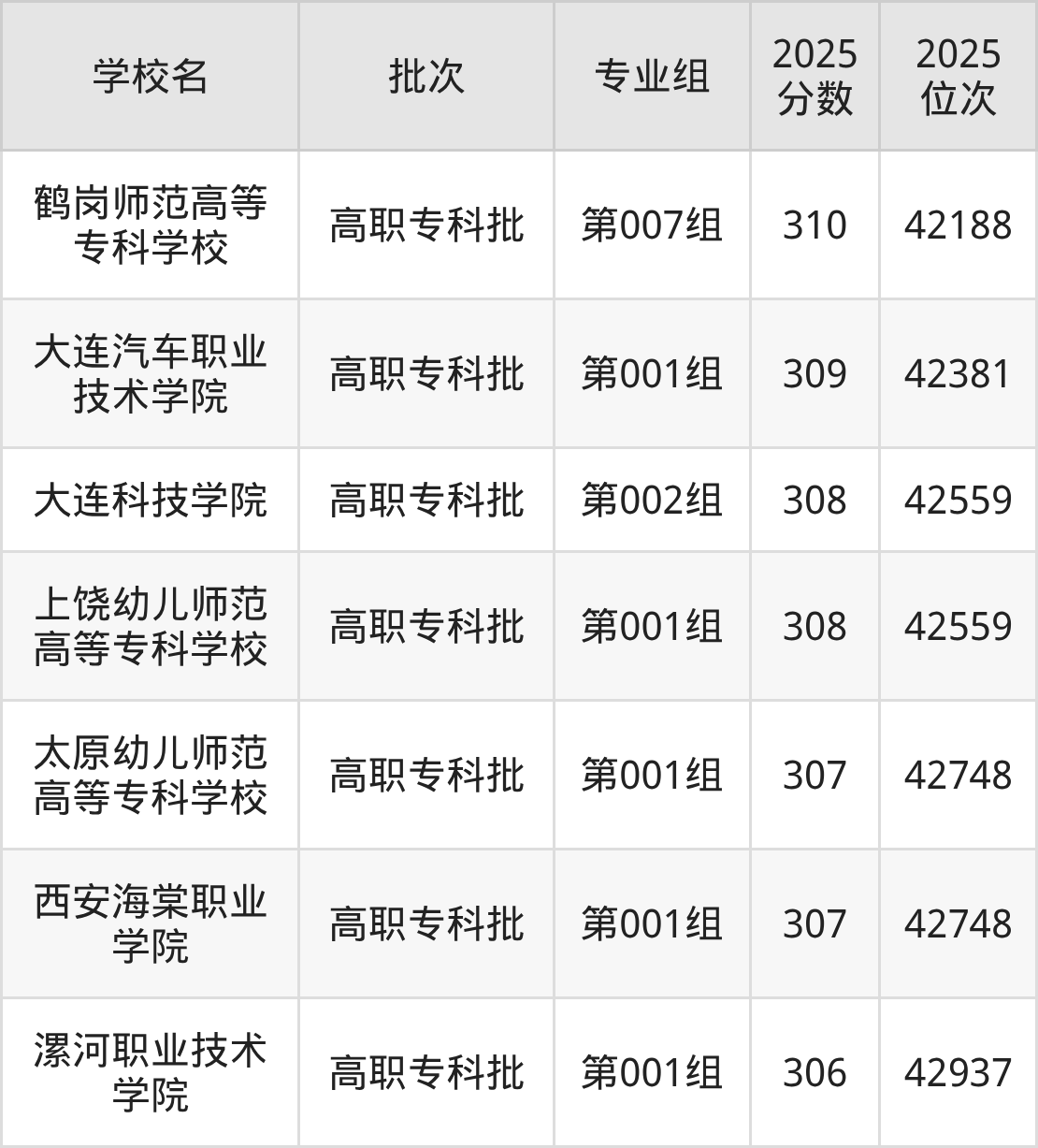 2025年黑龙江高考历史类308分(42382名~42559名)能上的大学有大连科技学院第002组、上饶幼儿师范高等专科学校第001组。