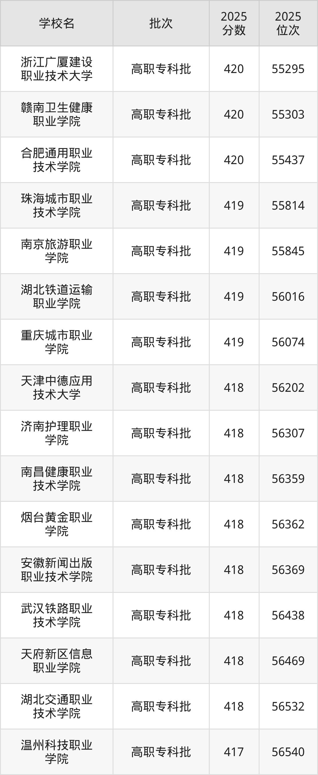 2025年贵州高考历史类419分(55696名~56106名)能上的大学有湖北铁道运输职业学院、珠海城市职业技术学院、重庆城市职业学院、南京旅游职业学院。