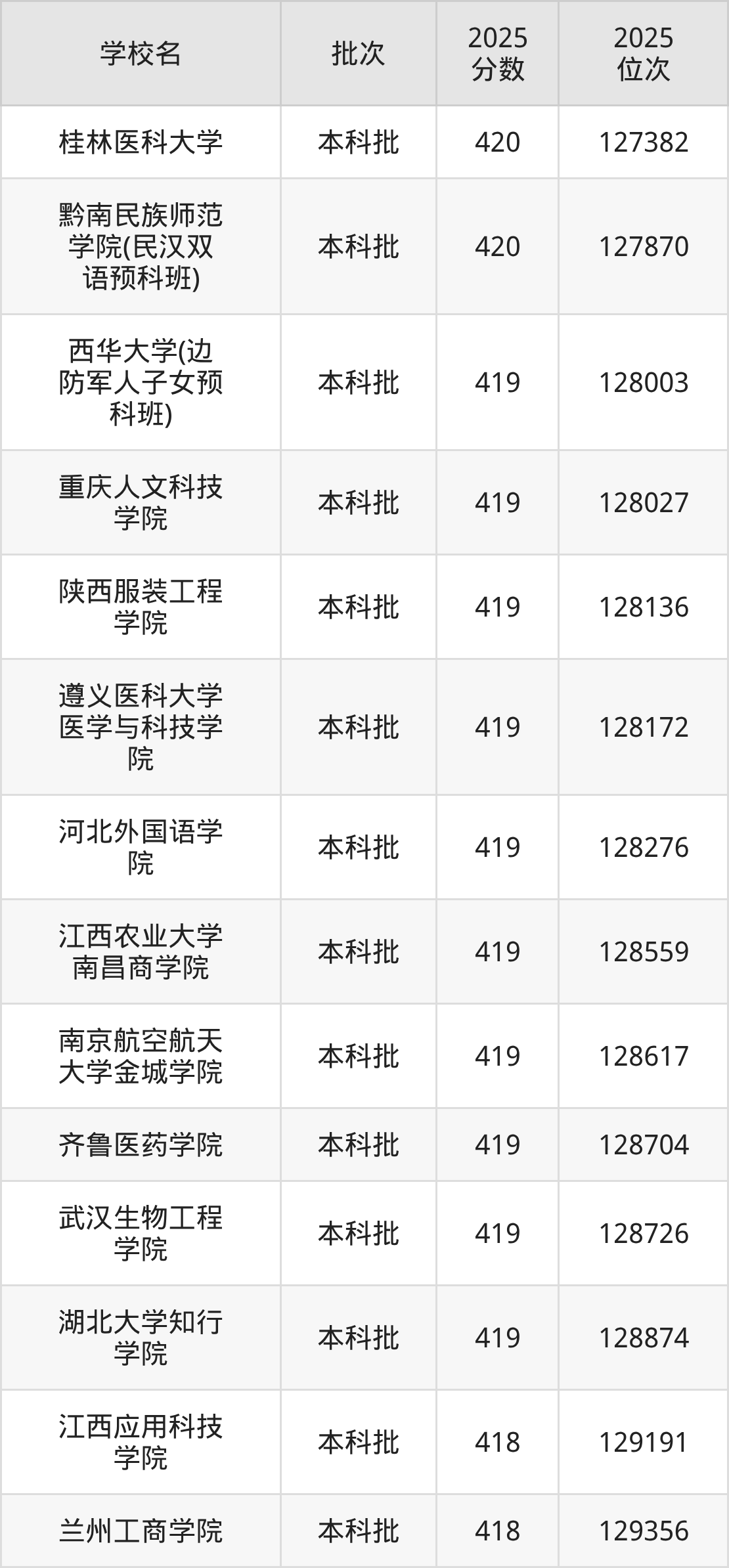 2025年贵州高考物理类419分(127875名~128879名)能上的大学有陕西服装工程学院、西华大学(边防军人子女预科班)、河北外国语学院、武汉生物工程学院等。