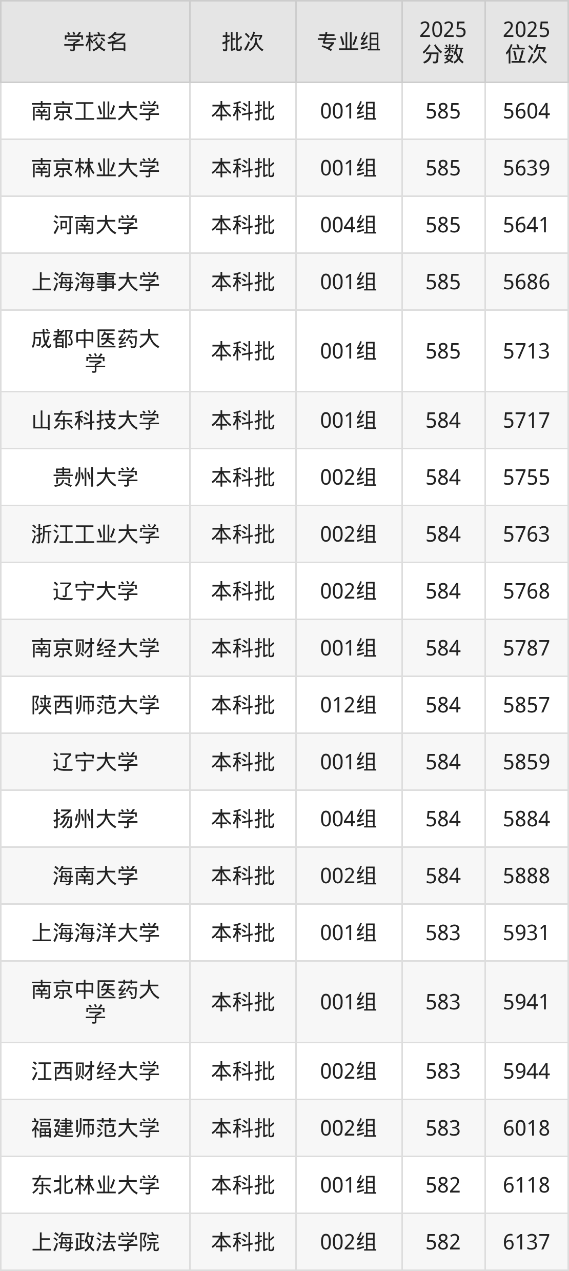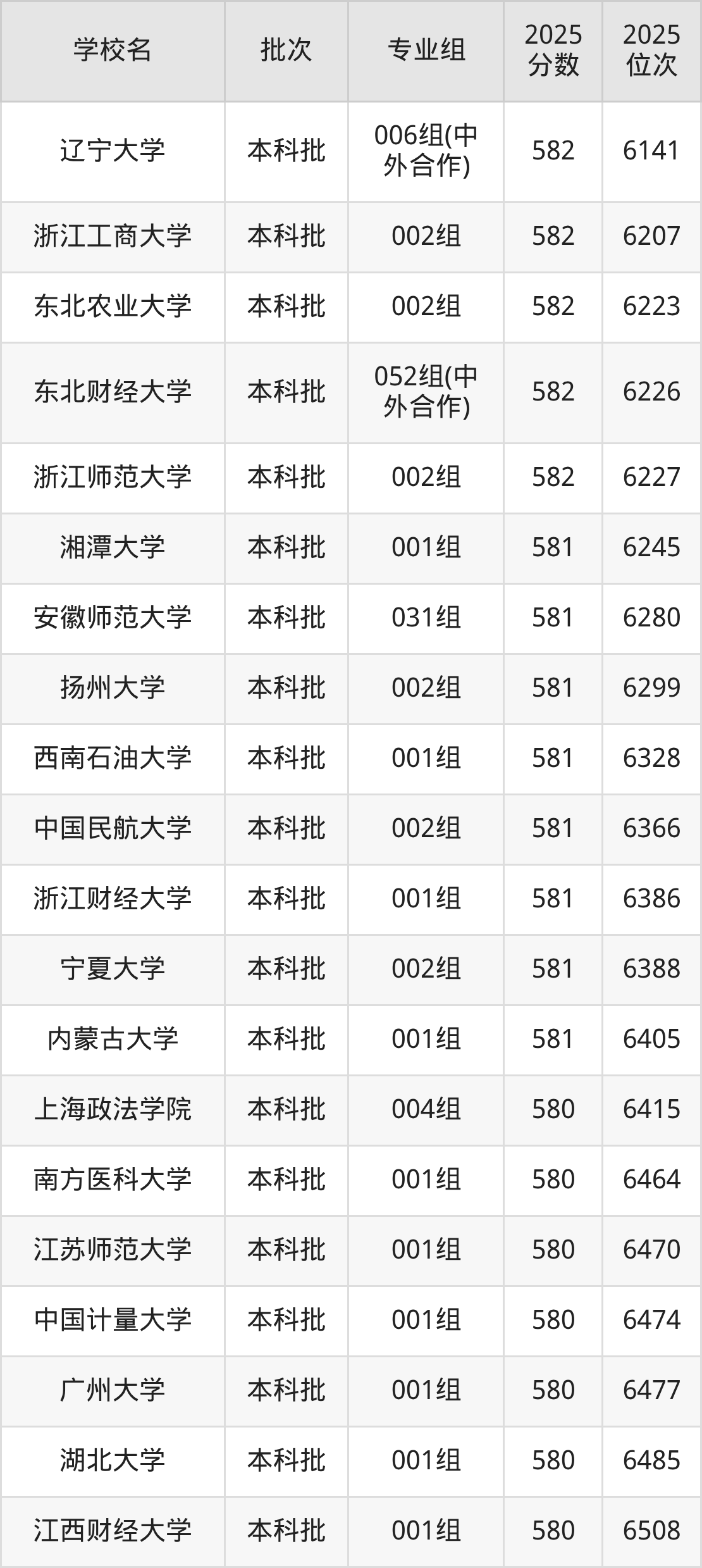 2025年安徽高考历史类582分(6081名~6237名)能上的大学有东北财经大学052组(中外合作)、东北林业大学001组、东北农业大学002组、辽宁大学006组(中外合作)等。