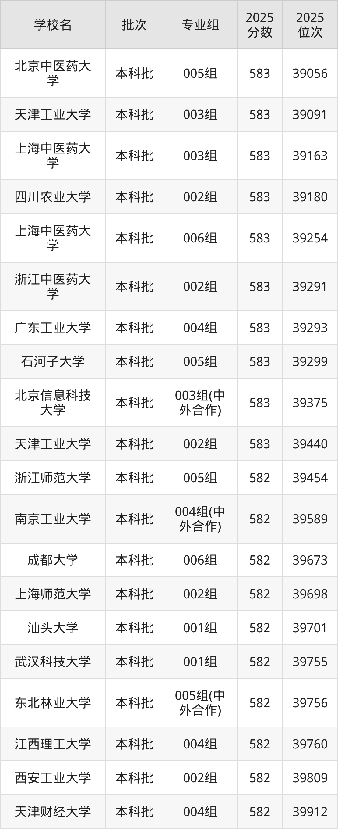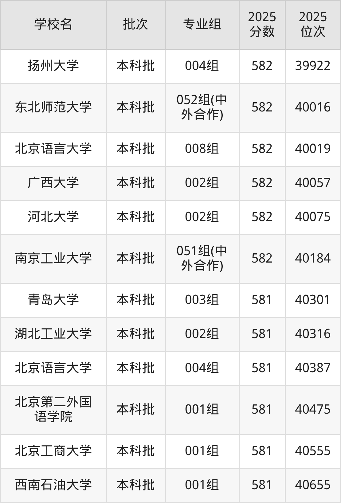 2025年安徽高考物理类582分(39449名~40231名)能上的大学有北京语言大学008组、成都大学006组、东北林业大学005组(中外合作)、东北师范大学052组(中外合作)等。