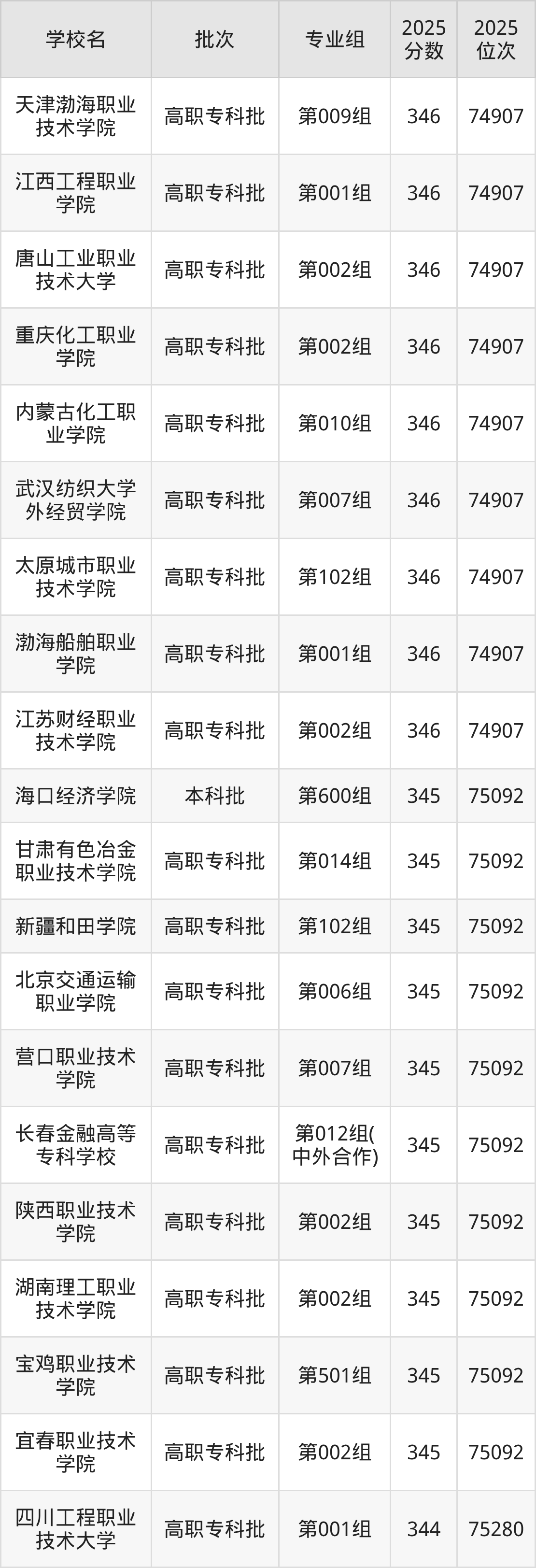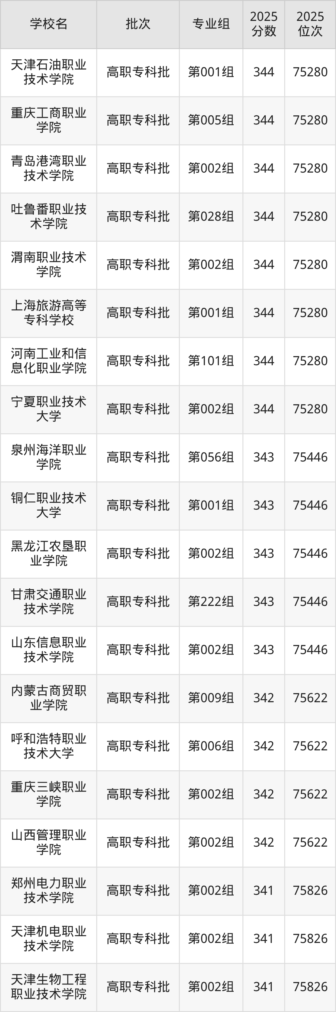 另外录取位次低于该区间(较稳妥)的有山西管理职业学院第002组(75622名)、呼和浩特职业技术大学第006组(75622名)等;录取位次高于该区间(可冲)的有吐鲁番职业技术学院第028组(75280名)、青岛港湾职业技术学院第002组(75280名)等。
