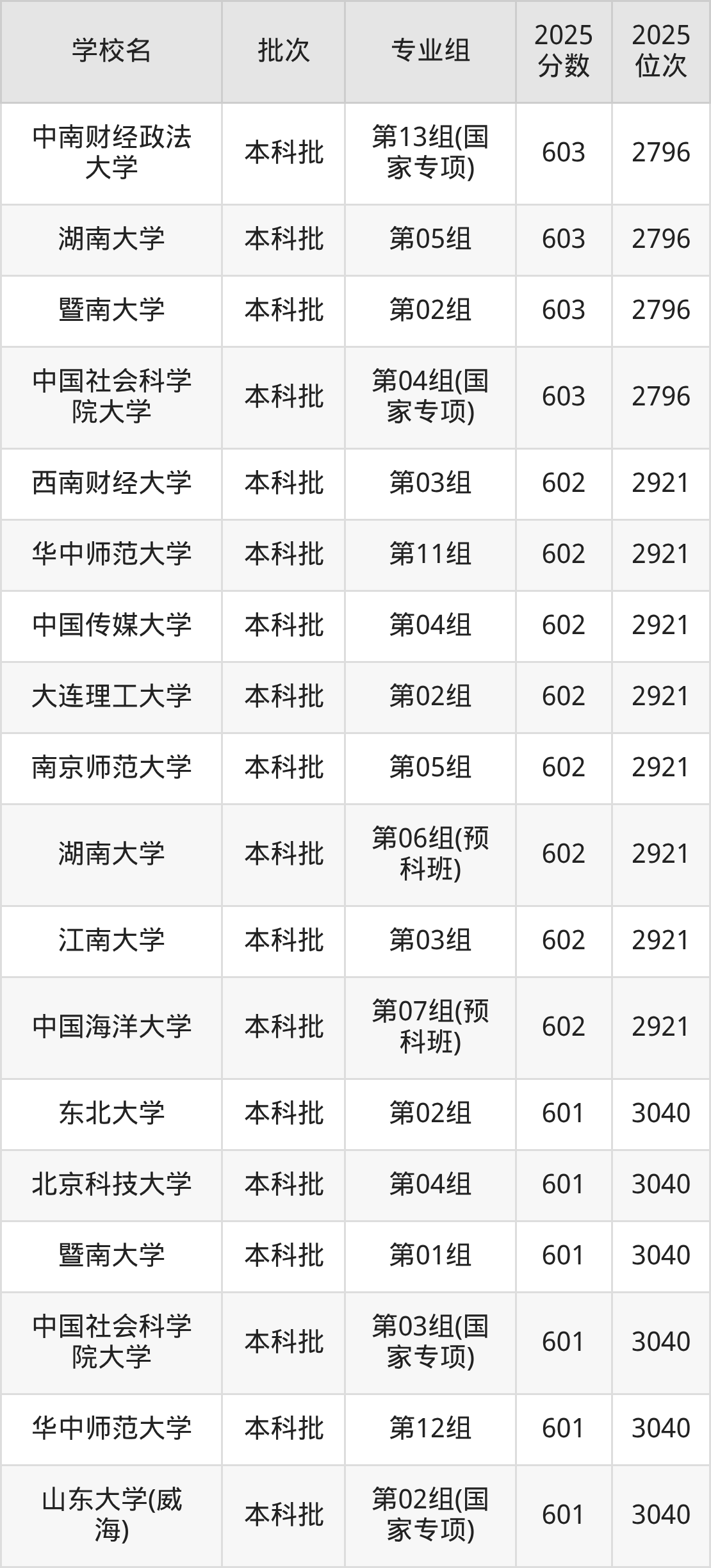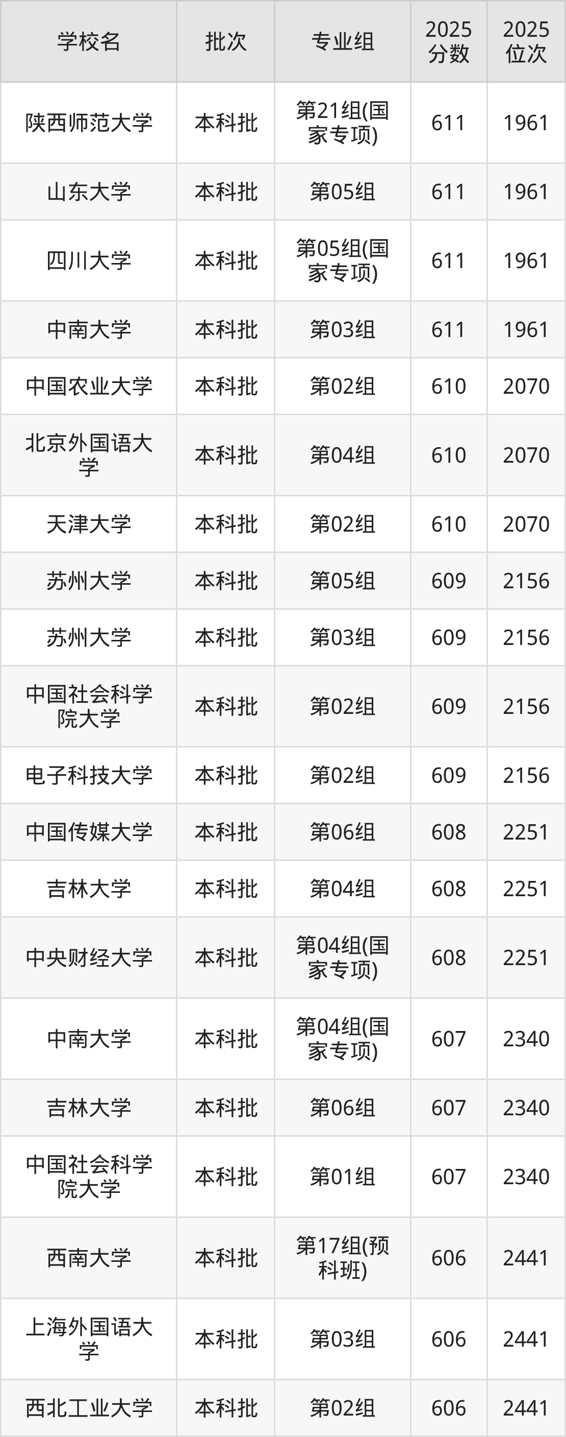 另外录取位次低于该区间(较稳妥)的有陕西师范大学第18组(民族班)(2690名)、湖南大学第07组(国家专项)(2690名)等;录取位次高于该区间(可冲)的有西南大学第17组(预科班)(2441名)、上海外国语大学第03组(2441名)等。