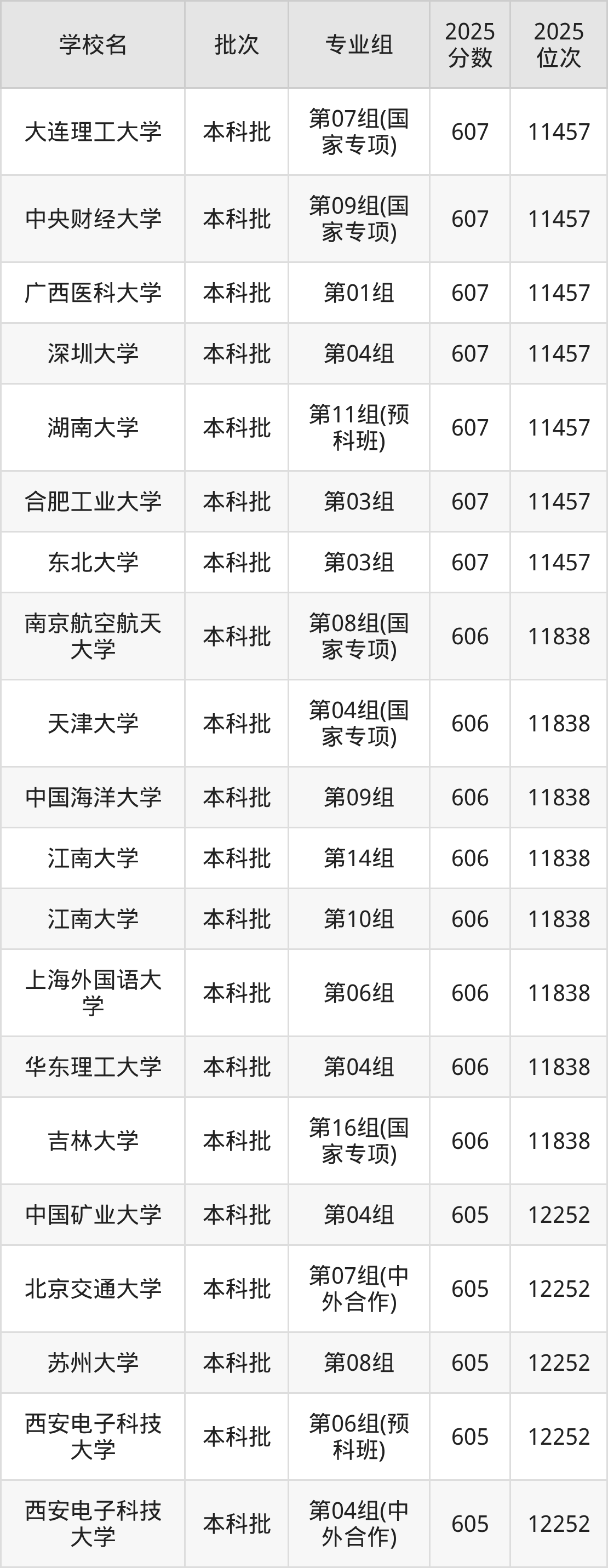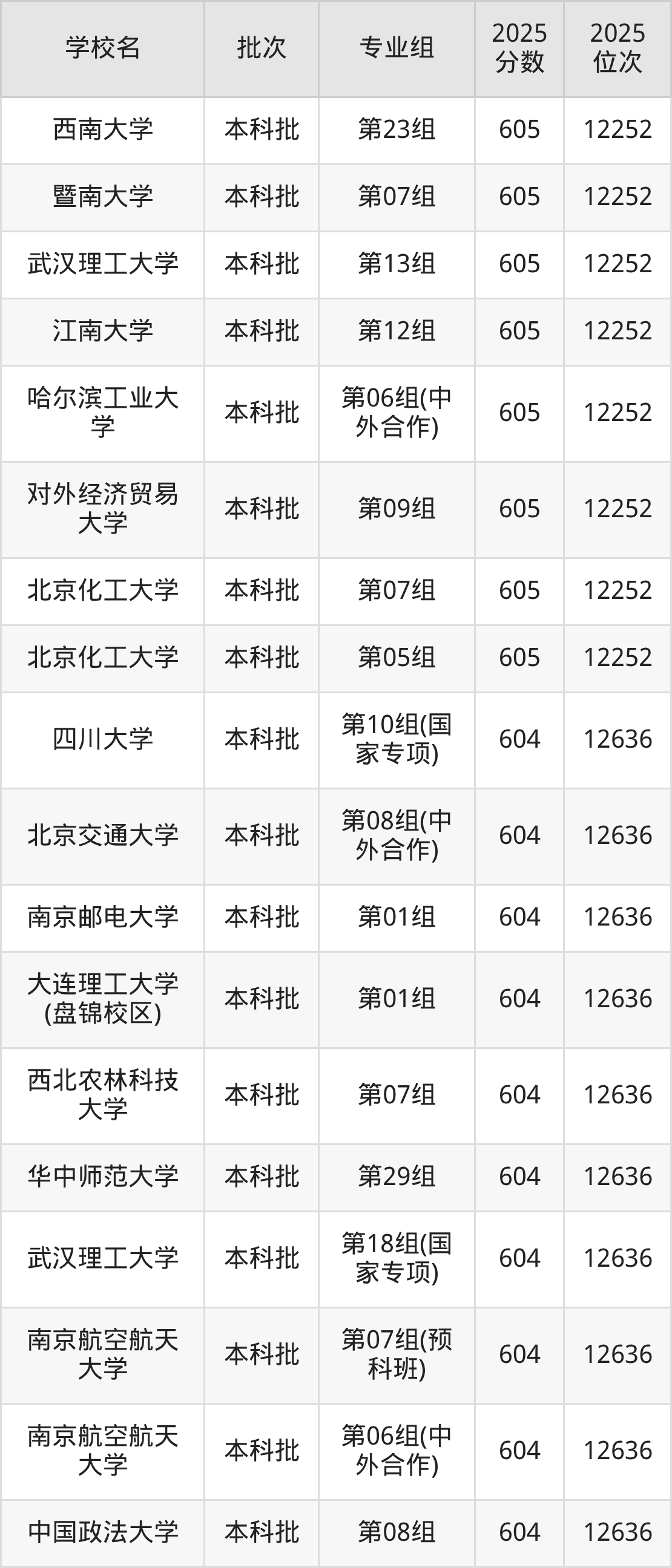 2025年湖北高考物理类605分(11839名~12252名)能上的大学有北京交通大学第07组(中外合作)、北京化工大学第05组、北京化工大学第07组、对外经济贸易大学第09组等。
