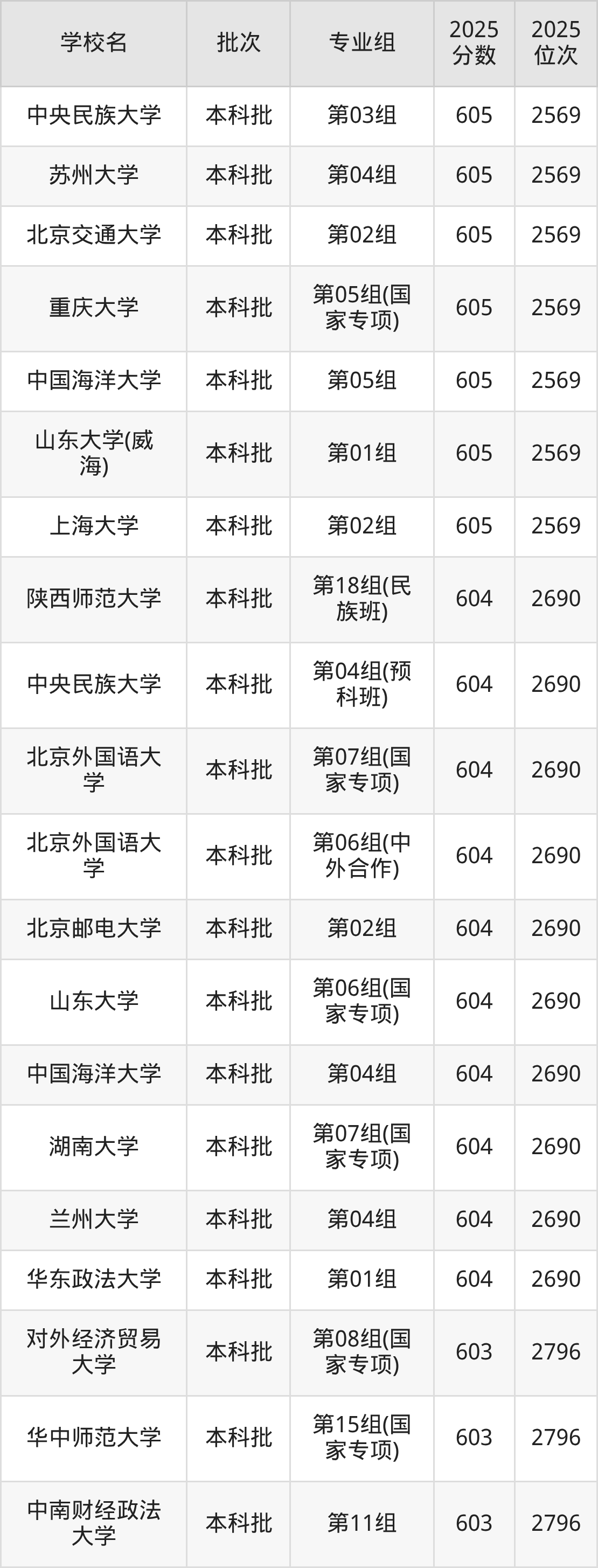 2025年湖北高考历史类605分(2442名~2569名)能上的大学有北京交通大学第02组、中央民族大学第03组、中国海洋大学第05组、重庆大学第05组(国家专项)等。