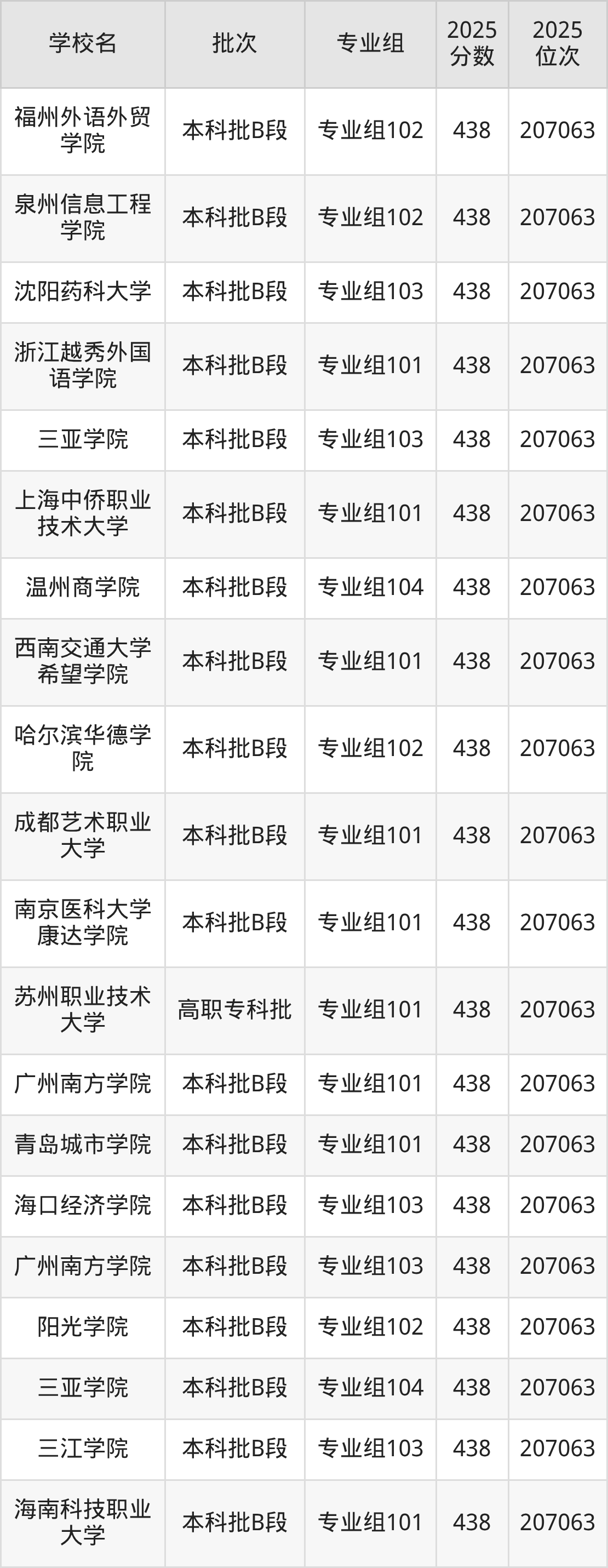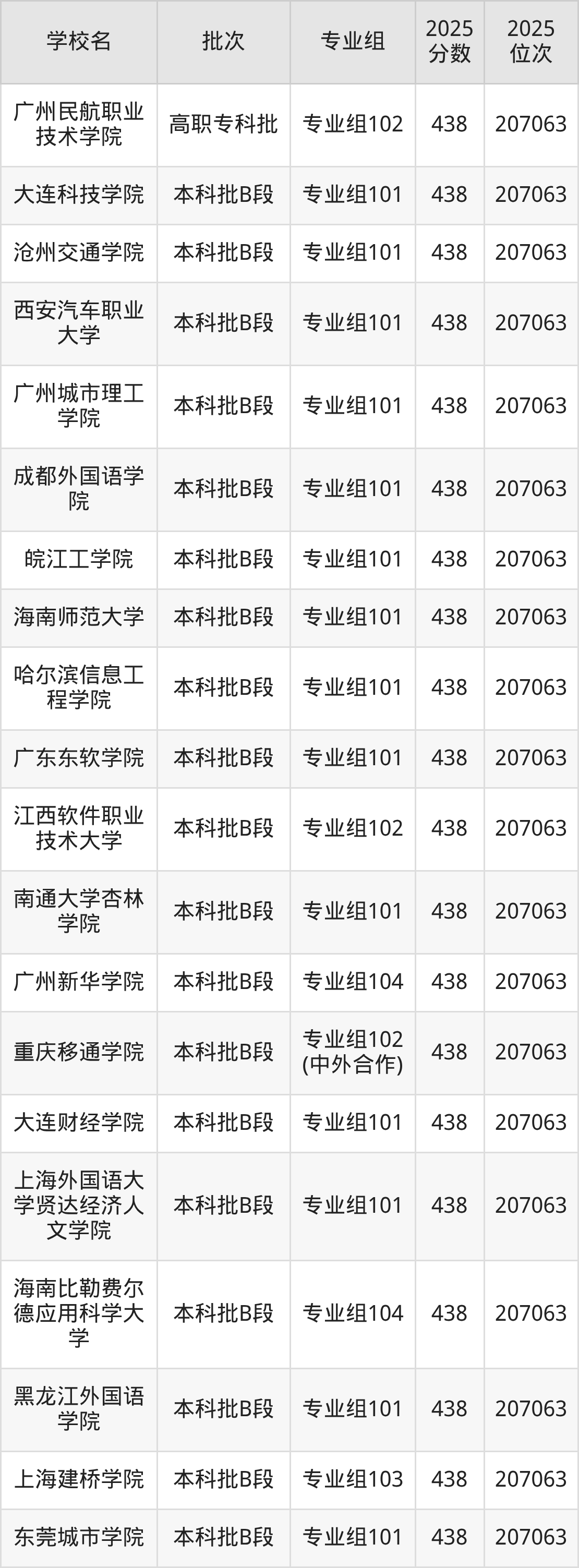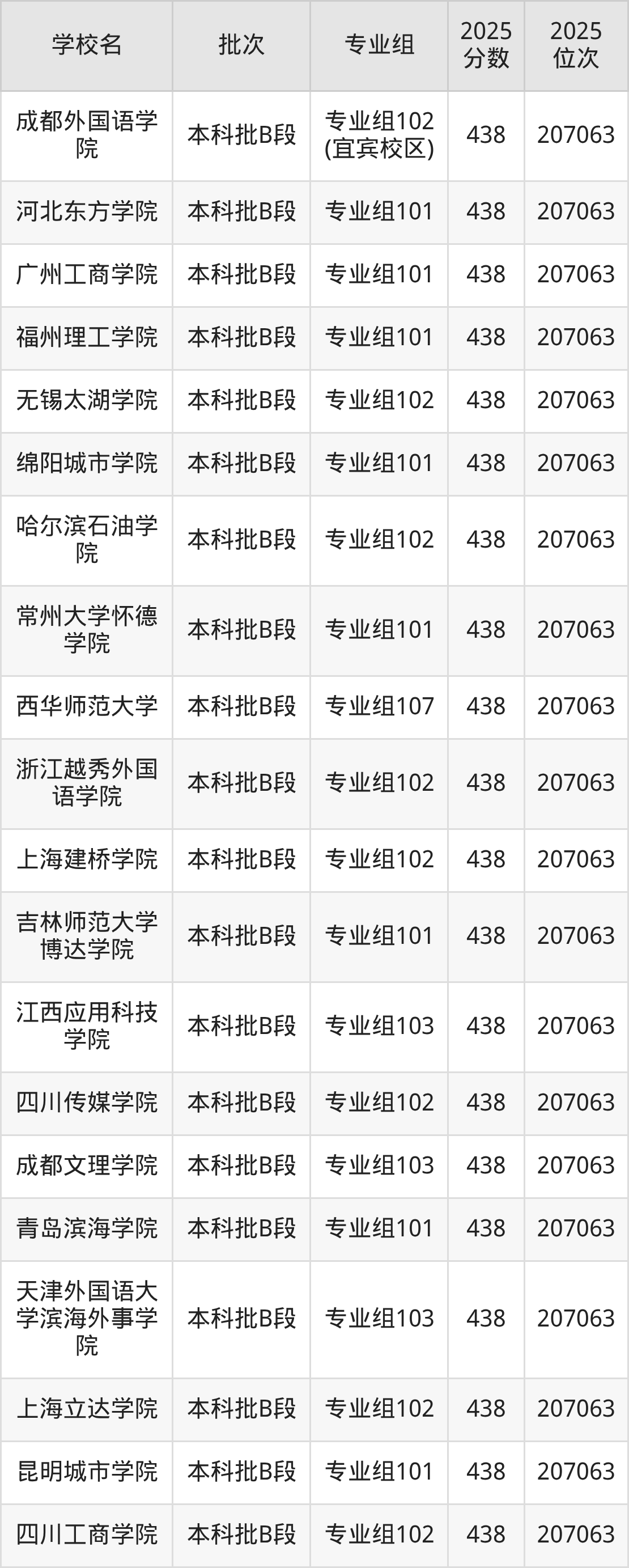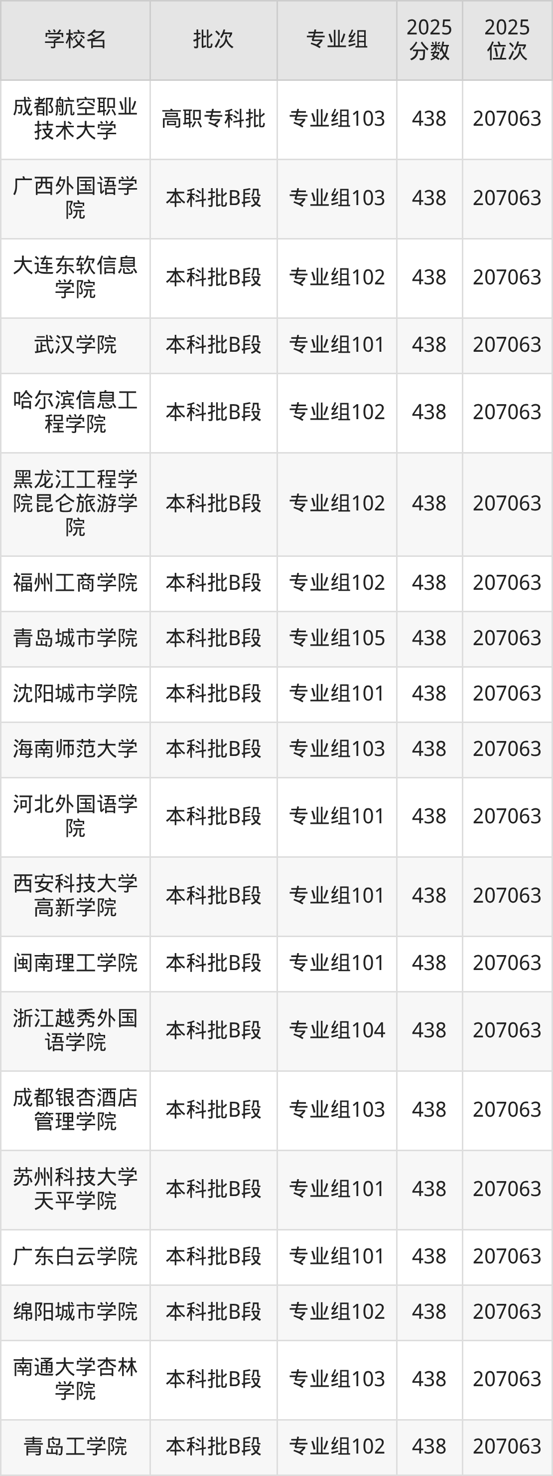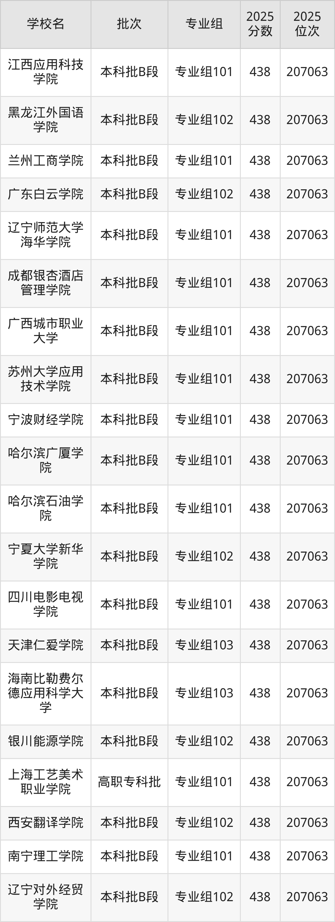 四川高考438分:历史类排名90536位、物理类排名207063位。该分数位次对应能上的大学历史类有重庆五一职业技术学院专业组101、北京经贸职业学院专业组101;物理类有大连理工大学城市学院专业组102、四川工业科技学院专业组101,更多名单如下文所示,2026届考生可参考。