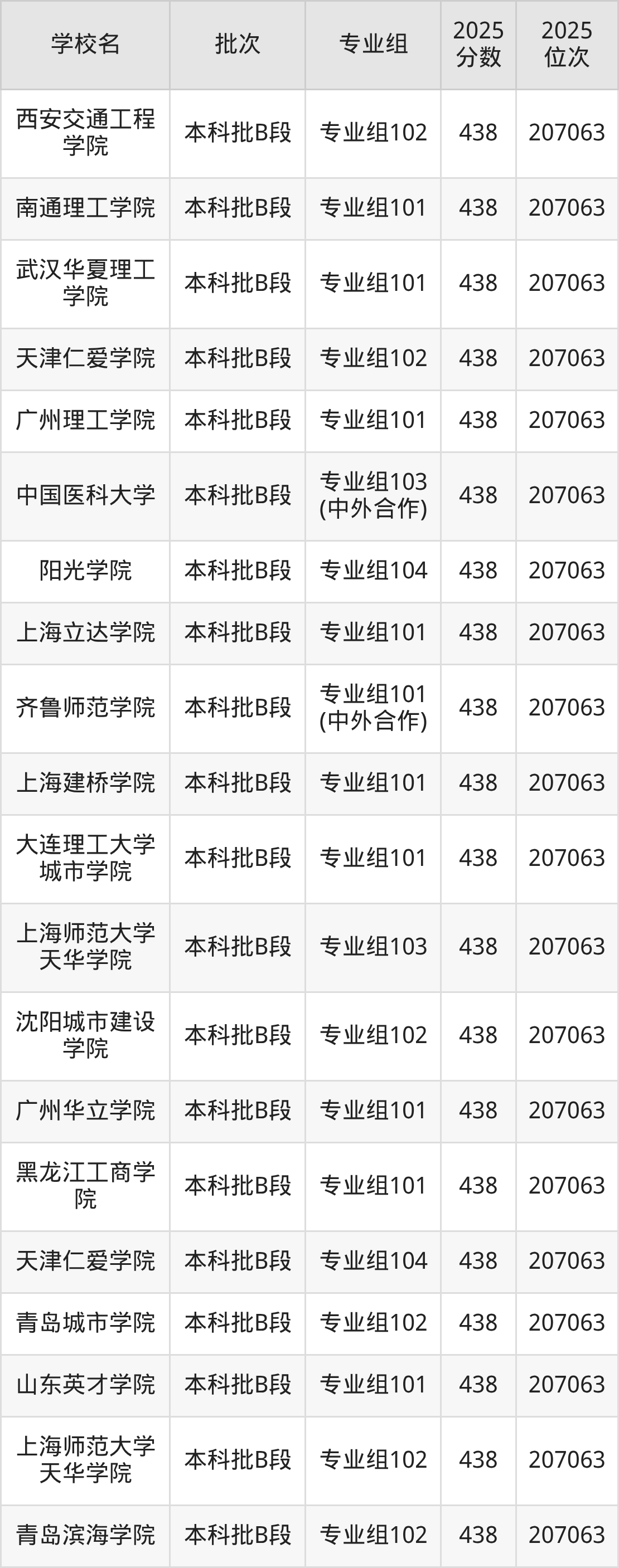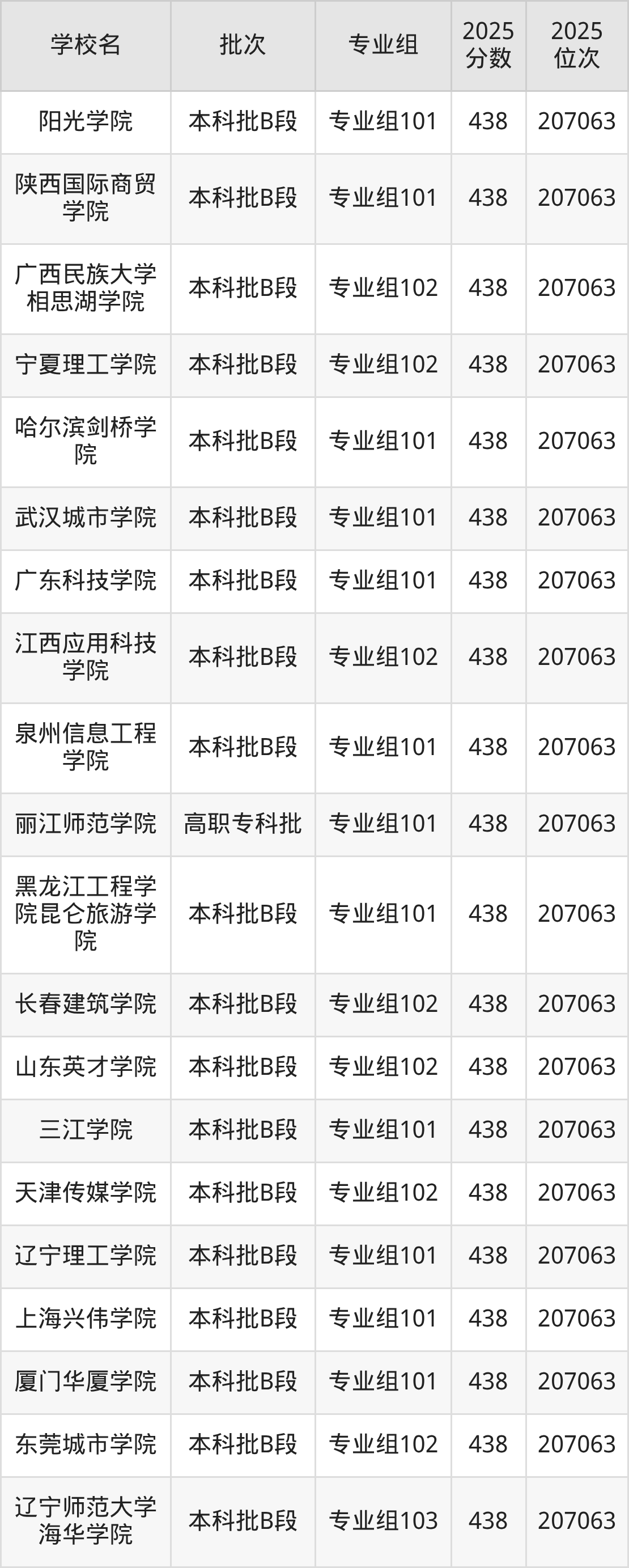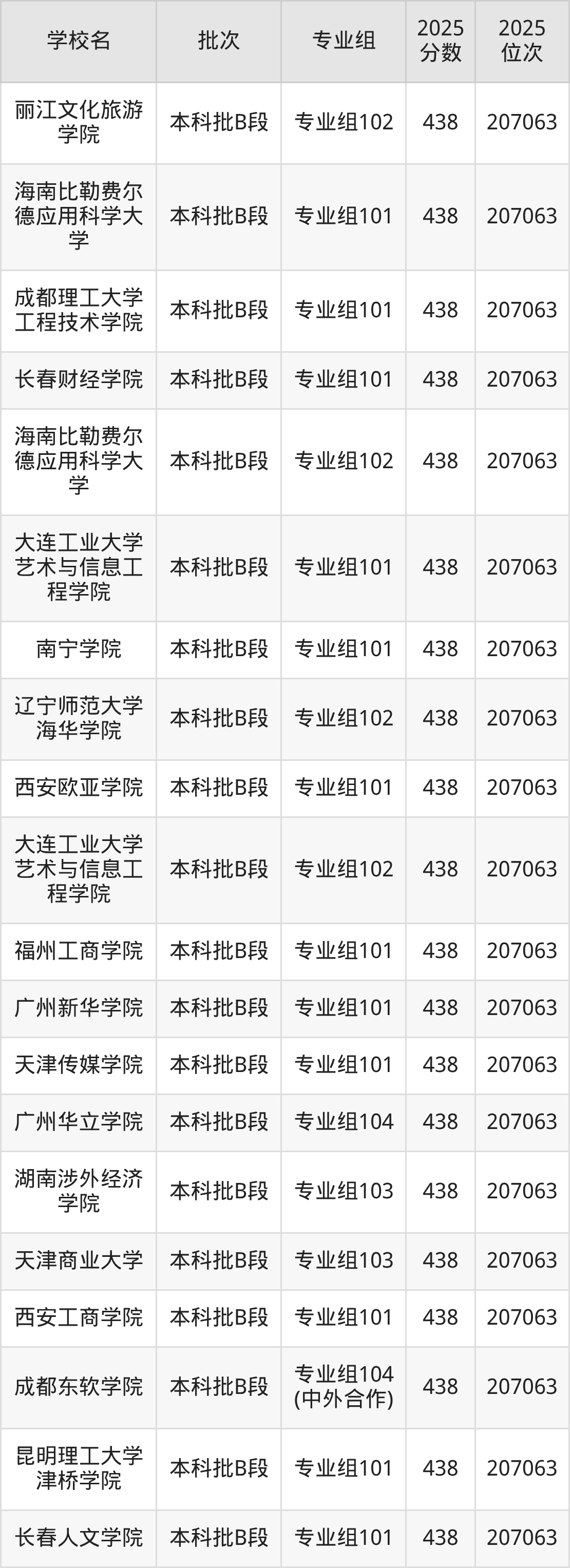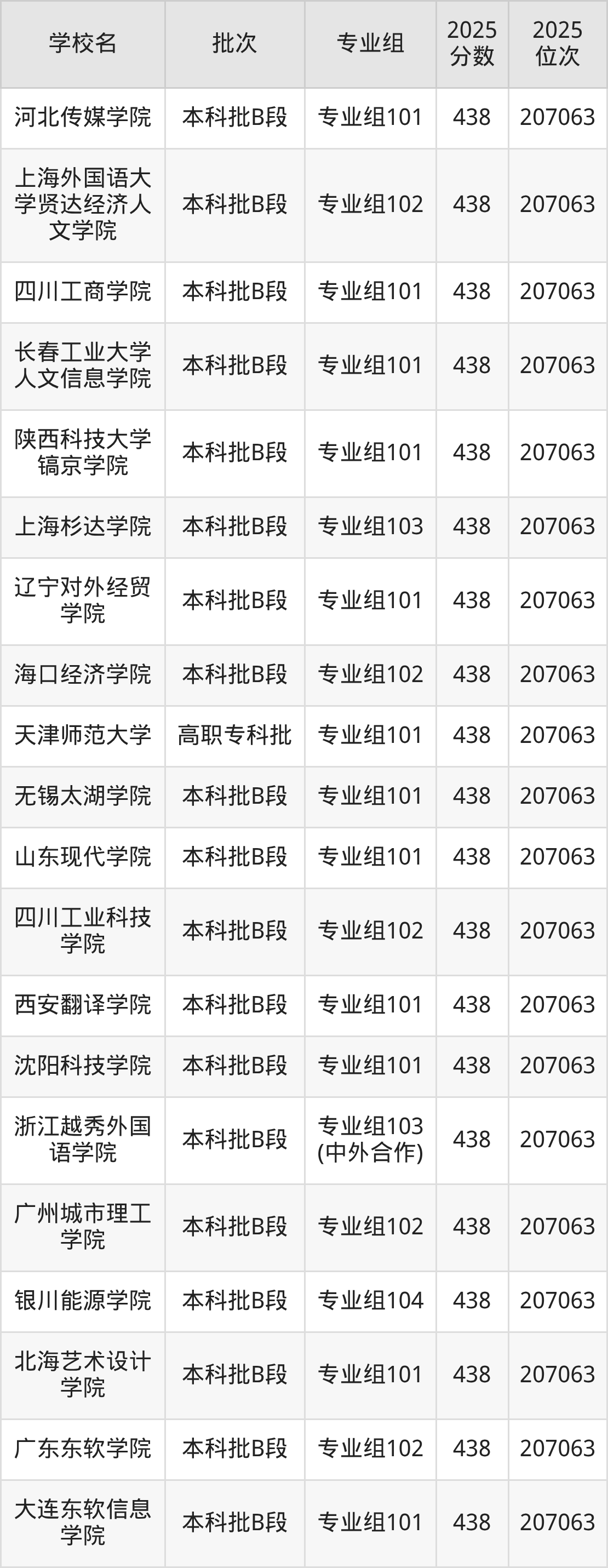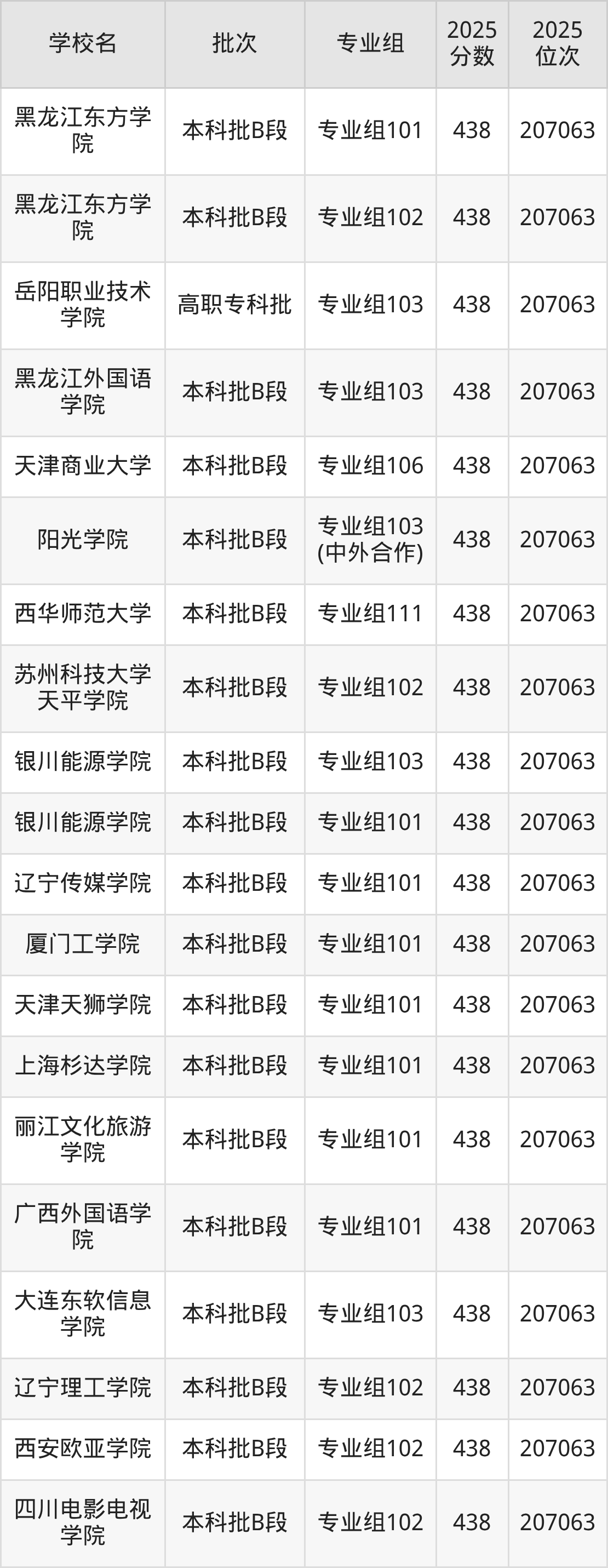 四川高考438分:历史类排名90536位、物理类排名207063位。该分数位次对应能上的大学历史类有重庆五一职业技术学院专业组101、北京经贸职业学院专业组101;物理类有大连理工大学城市学院专业组102、四川工业科技学院专业组101,更多名单如下文所示,2026届考生可参考。