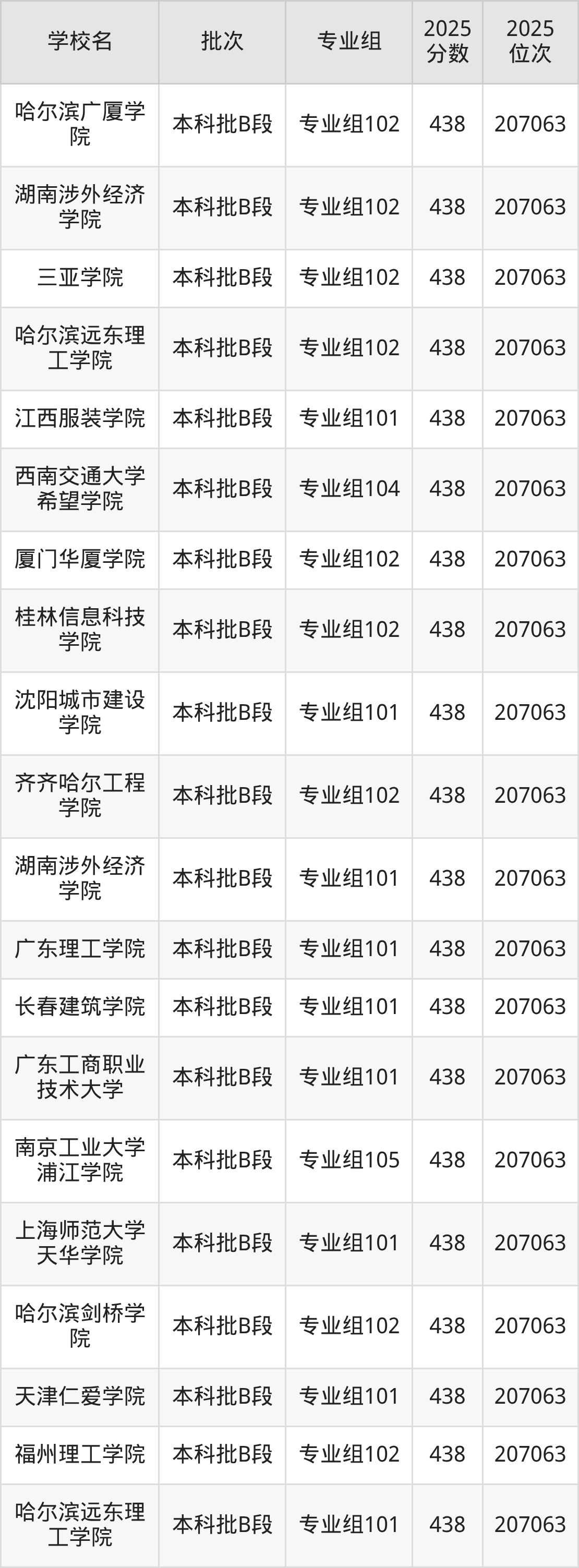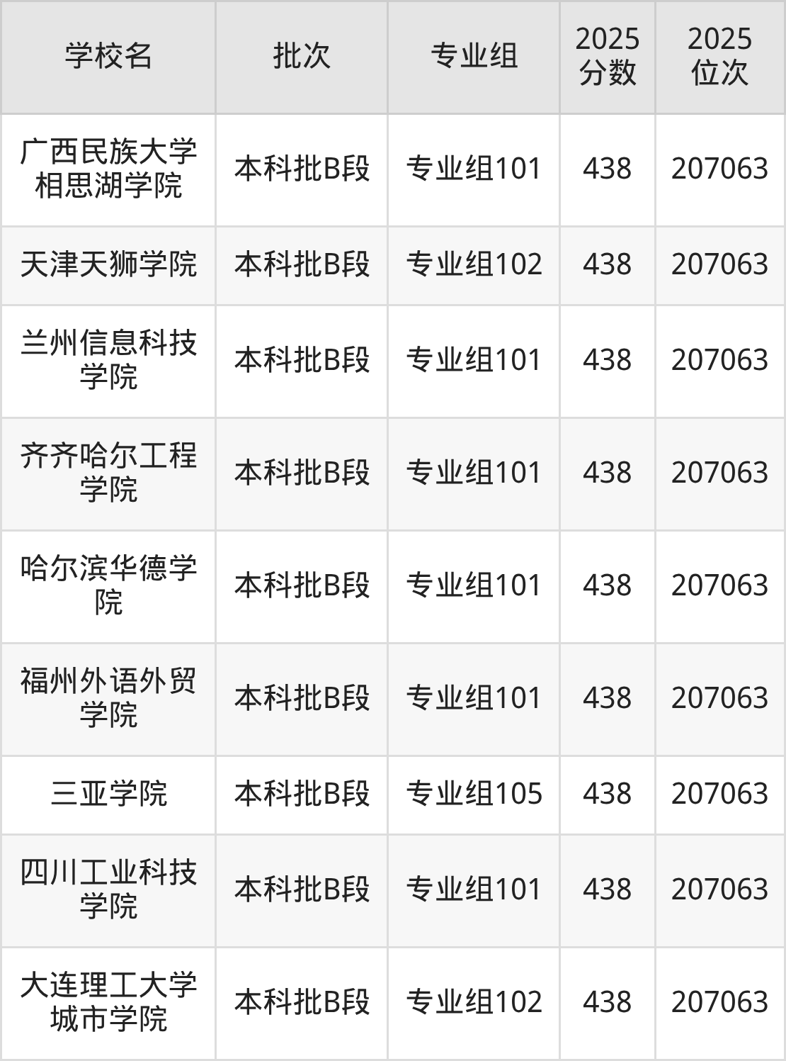 2025年四川高考物理类438分(206007名~207063名)能上的大学有大连理工大学城市学院专业组102、四川工业科技学院专业组101、三亚学院专业组105、福州外语外贸学院专业组101等。
