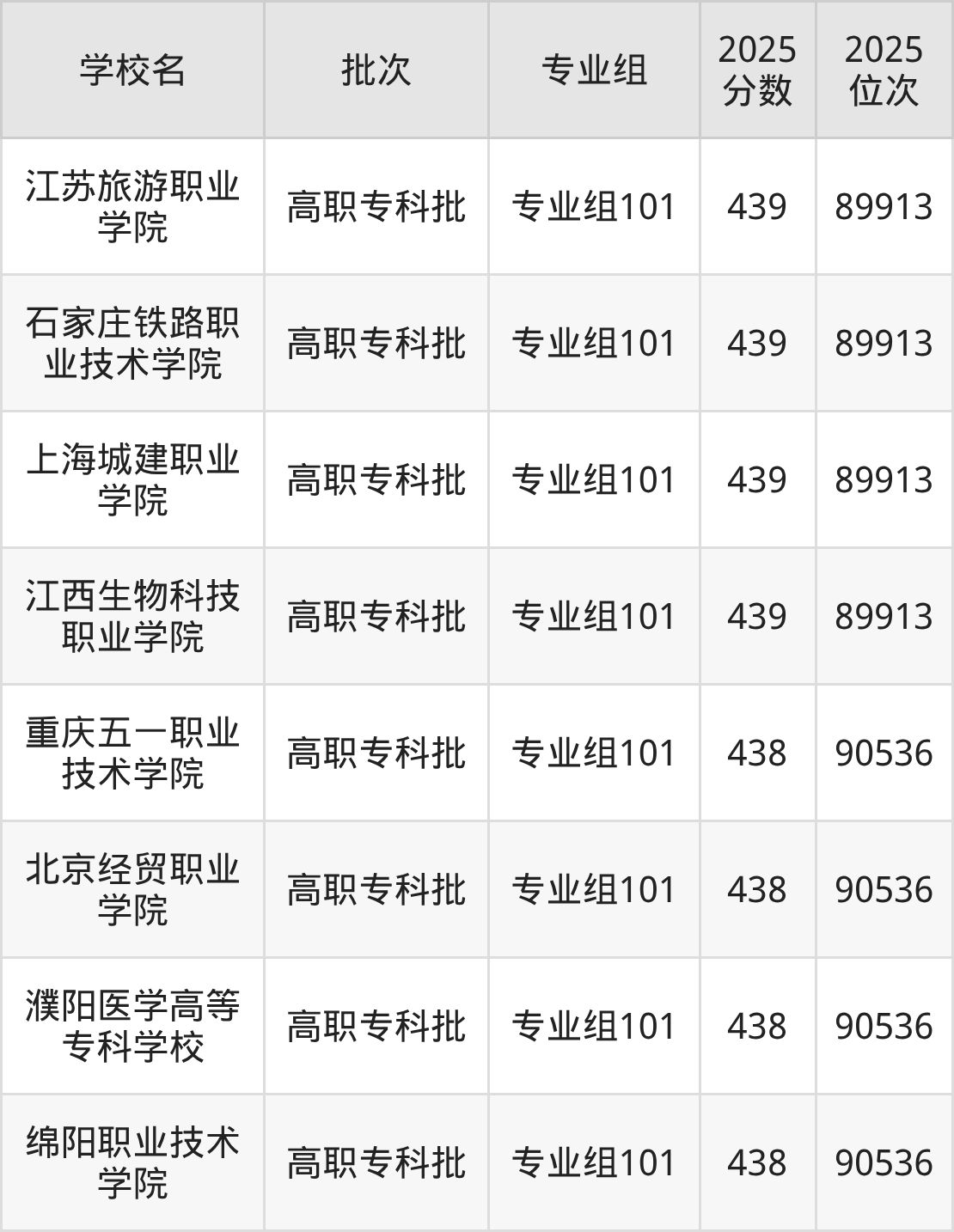 2025年四川高考历史类438分(89914名~90536名)能上的大学有重庆五一职业技术学院专业组101、北京经贸职业学院专业组101、濮阳医学高等专科学校专业组101、绵阳职业技术学院专业组101。