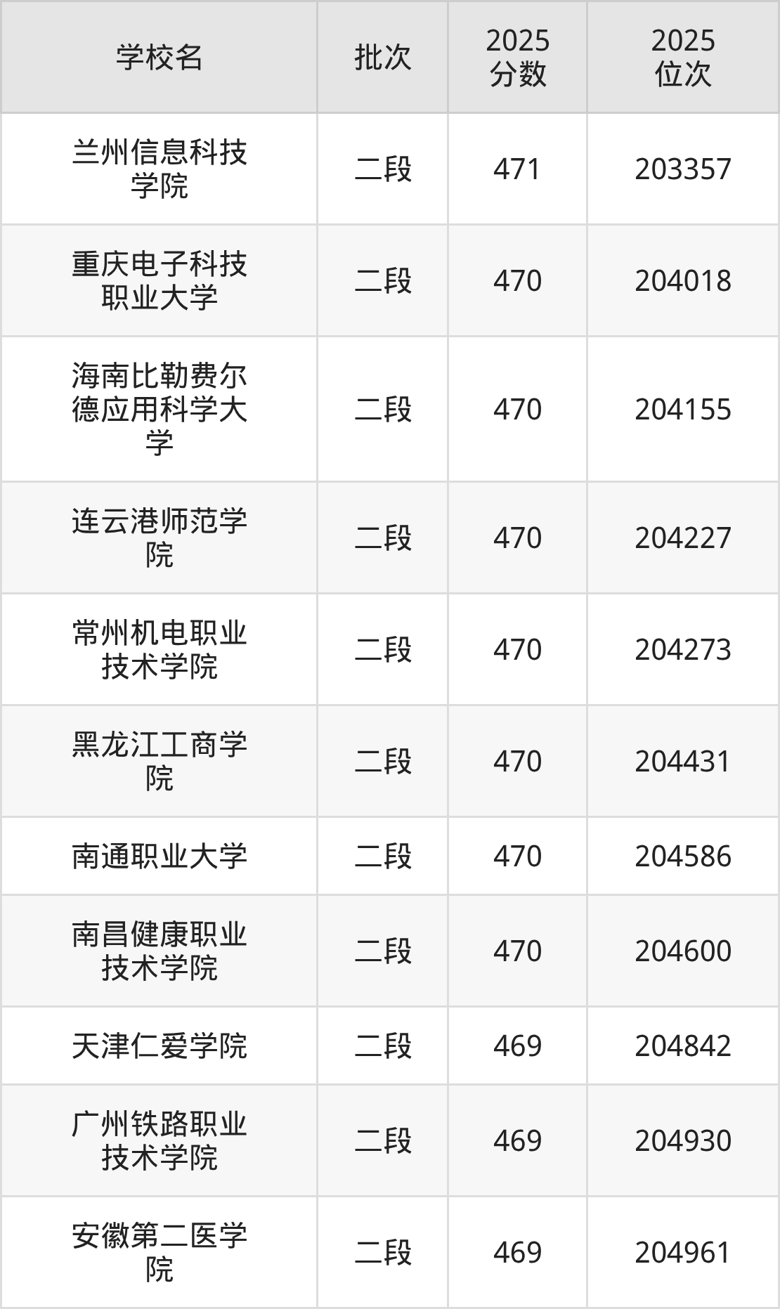 2025年浙江高考470分(203849名~204772名)能上的大学有南通职业大学、南昌健康职业技术学院、常州机电职业技术学院、黑龙江工商学院等。