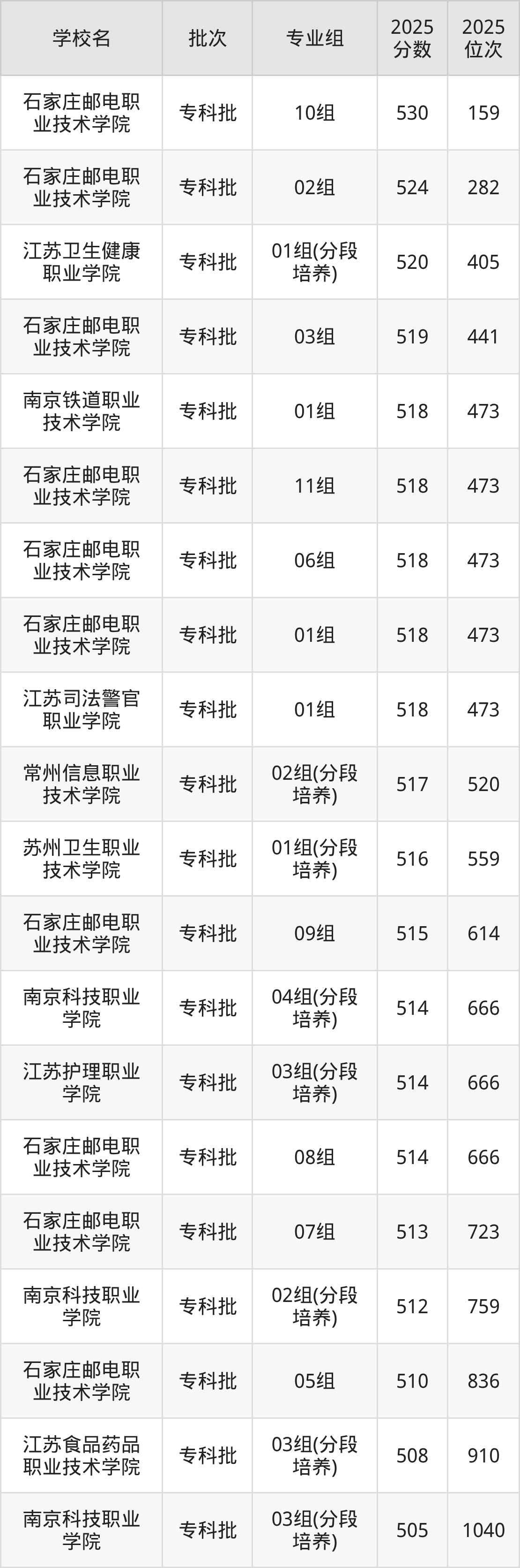 另外录取位次低于该区间(较稳妥)的有石家庄邮电职业技术学院07组(723名)、南京科技职业学院02组(分段培养)(759名)等;录取位次高于该区间(可冲)的有无锡太湖学院01组(40423名)、新疆农业大学02组(40423名)等。