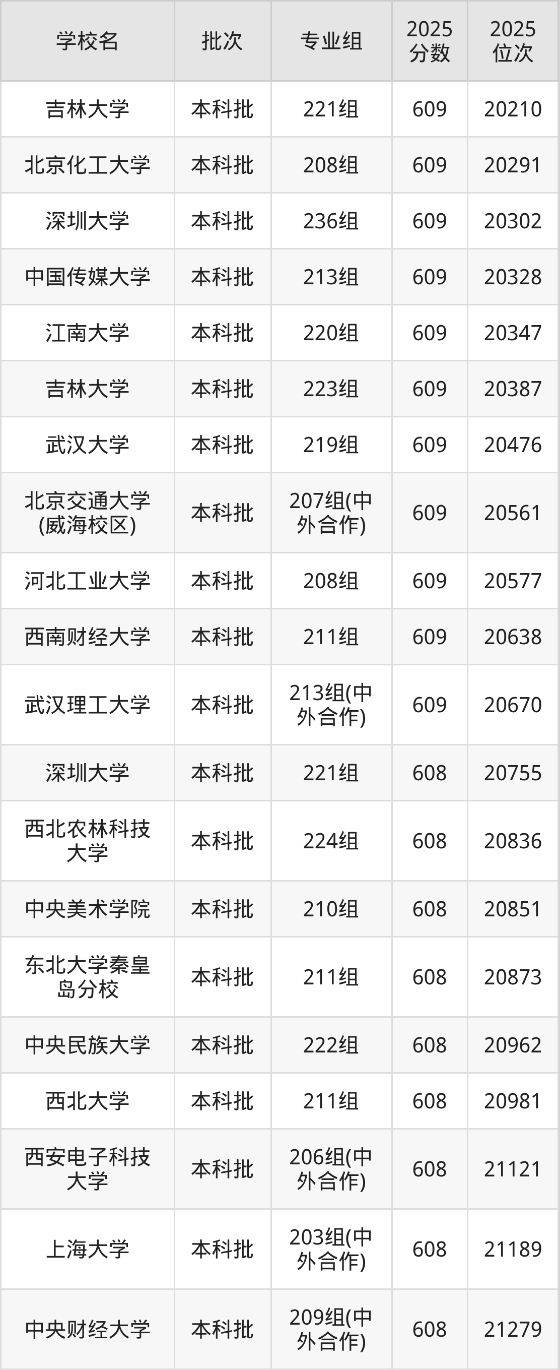 2025年广东高考物理类608分(20683名~21322名)能上的大学有中央财经大学209组(中外合作)、中央美术学院210组、中央民族大学222组、上海大学203组(中外合作)等。