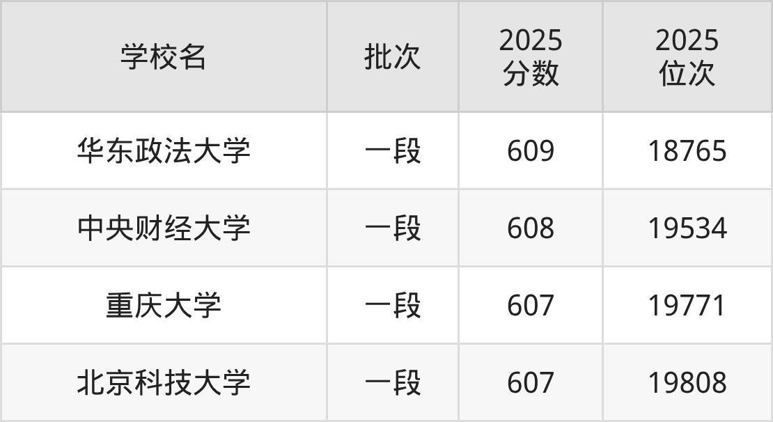 另外录取位次低于该区间(较稳妥)的有重庆大学(19771名)、北京科技大学(19808名)等;录取位次高于该区间(可冲)的有华东政法大学(18765名)、华中科技大学(18287名)等。