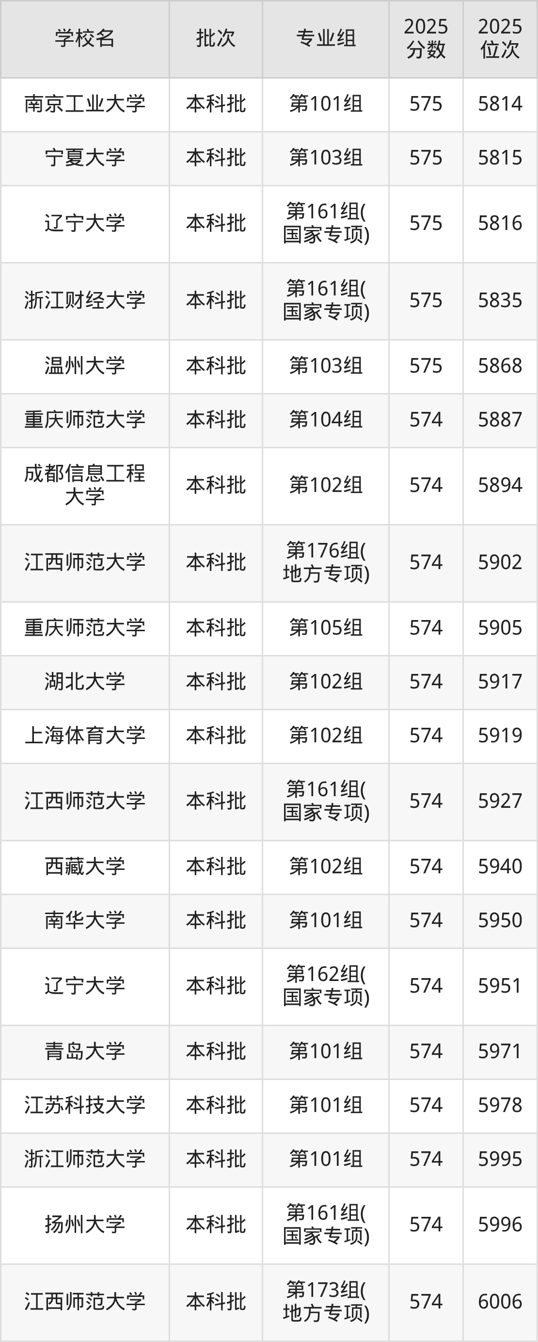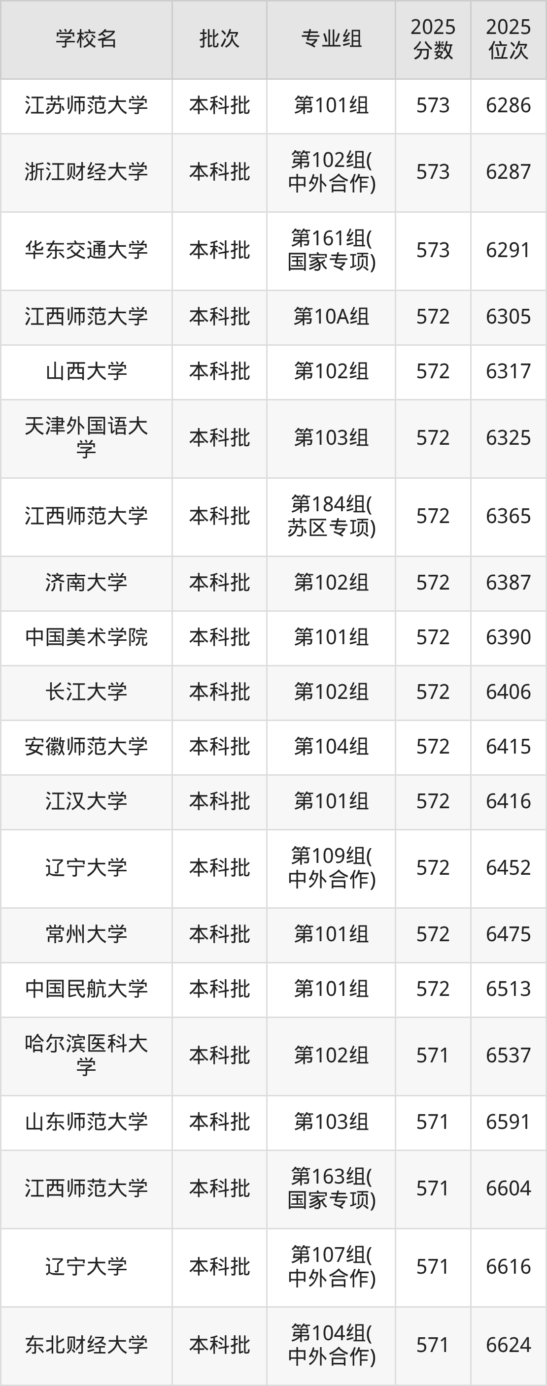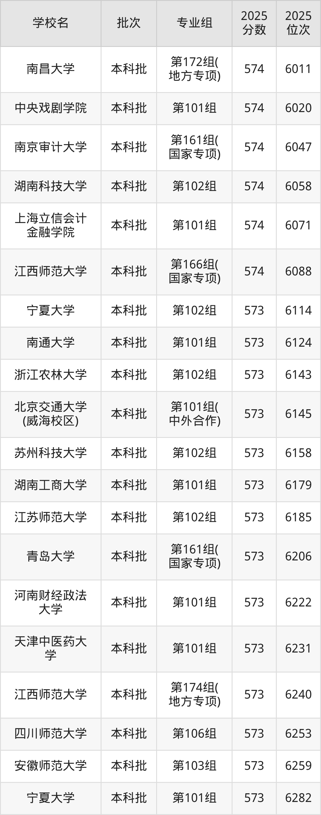 2025年江西高考历史类573分(6107名~6296名)能上的大学有安徽师范大学第103组、四川师范大学第106组、北京交通大学(威海校区)第101组(中外合作)、宁夏大学第101组等。