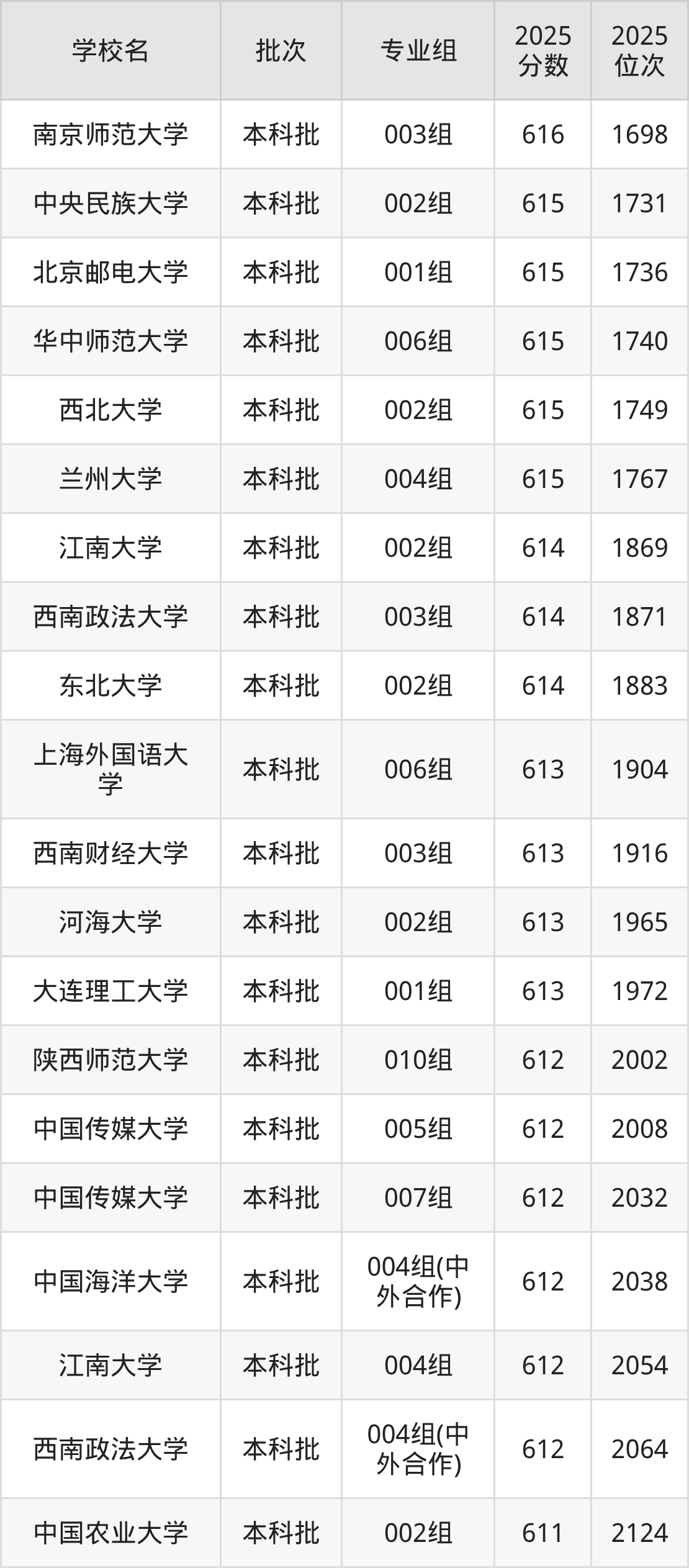 2025年安徽高考历史类610分(2199名~2298名)能上的大学有暨南大学002组、江南大学001组、江南大学006组、上海大学001组。