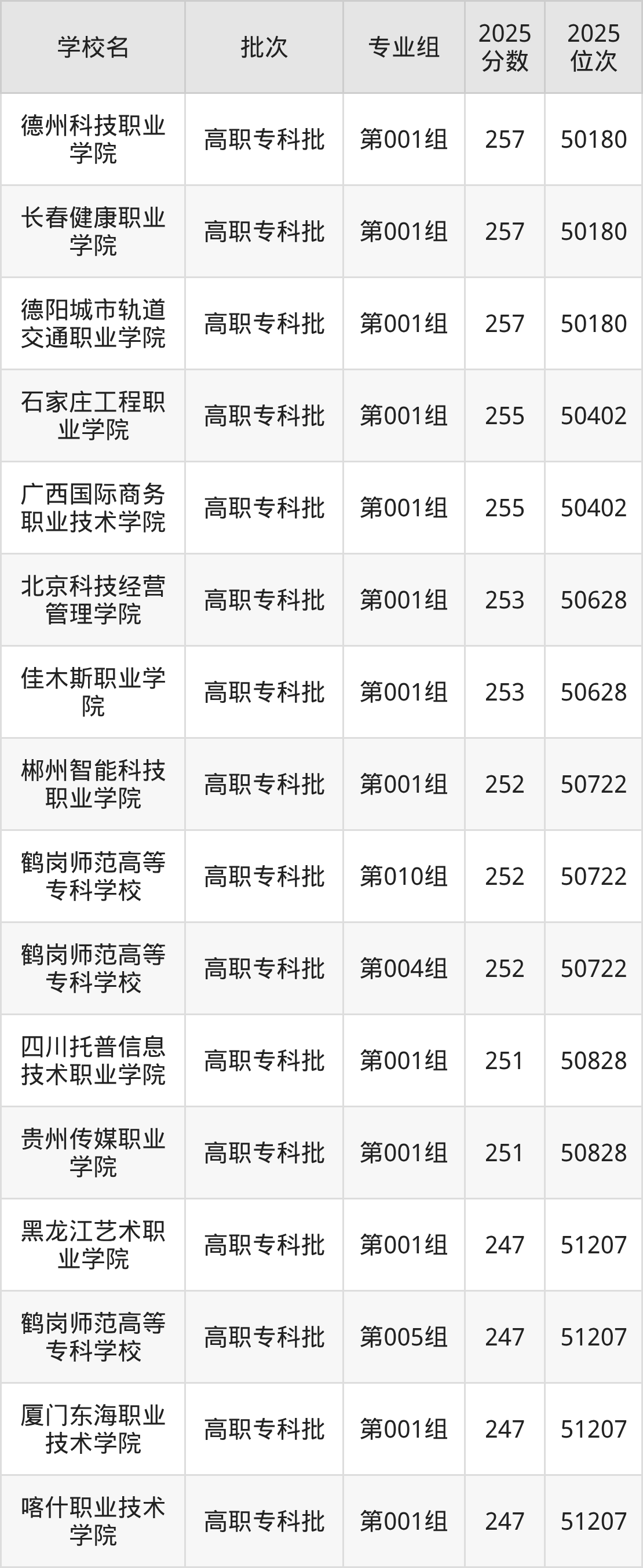 2025年黑龙江高考历史类252分(50629名~50722名)能上的大学有鹤岗师范高等专科学校第004组、鹤岗师范高等专科学校第010组、郴州智能科技职业学院第001组。