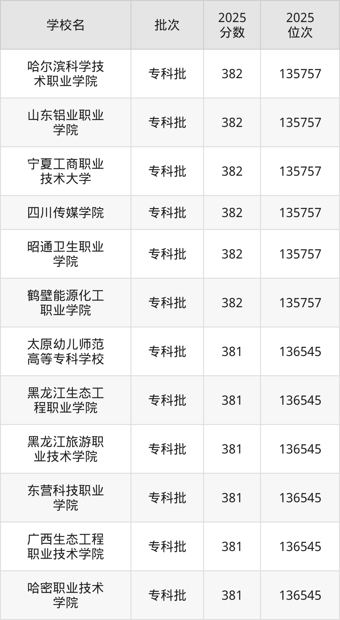 2025年河北高考历史类381分(135758名~136545名)能上的大学有黑龙江生态工程职业学院、黑龙江旅游职业技术学院、东营科技职业学院、广西生态工程职业技术学院等。