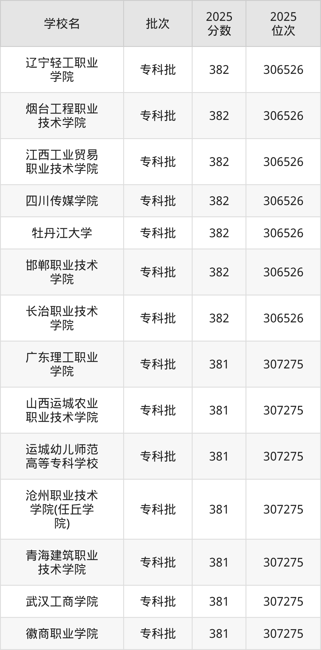 2025年河北高考物理类381分(306527名~307275名)能上的大学有广东理工职业学院、山西运城农业职业技术学院、沧州职业技术学院(任丘学院)、运城幼儿师范高等专科学校等。