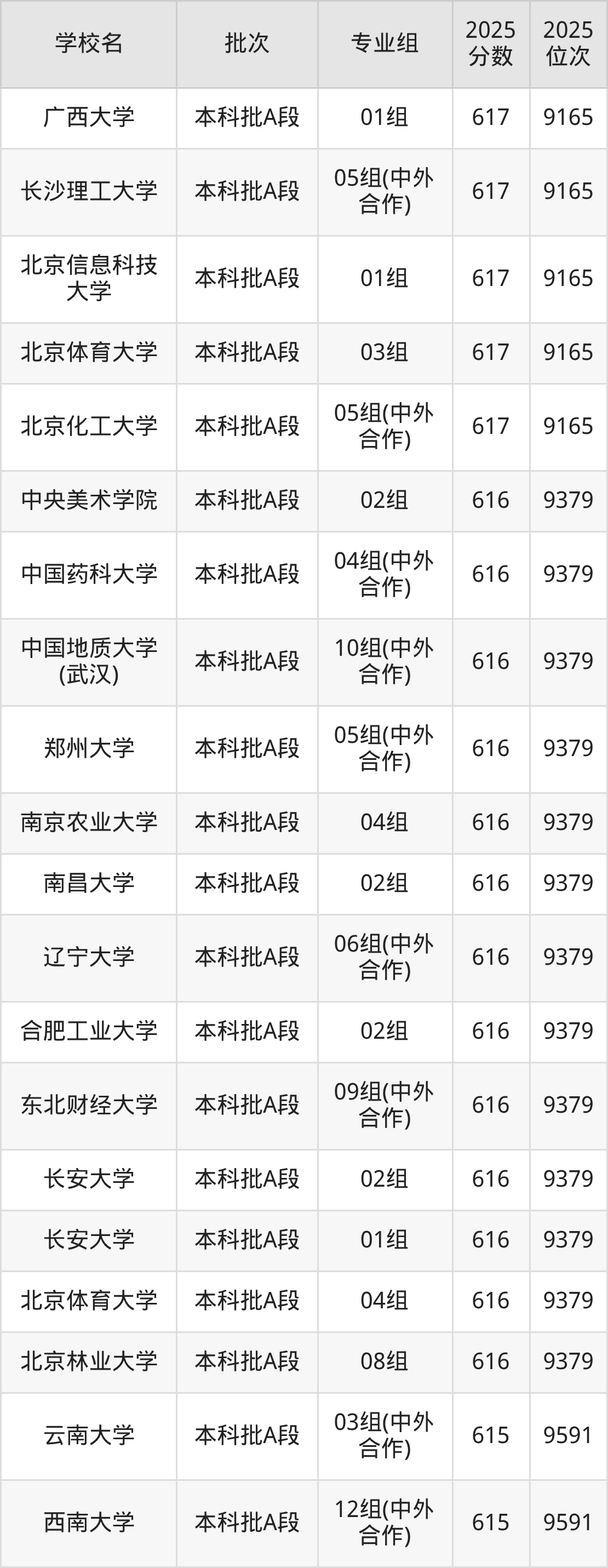 2025年天津高考615分(9380名~9591名)能上的大学有北京体育大学02组、北京体育大学05组、长安大学03组、贵州大学03组等。