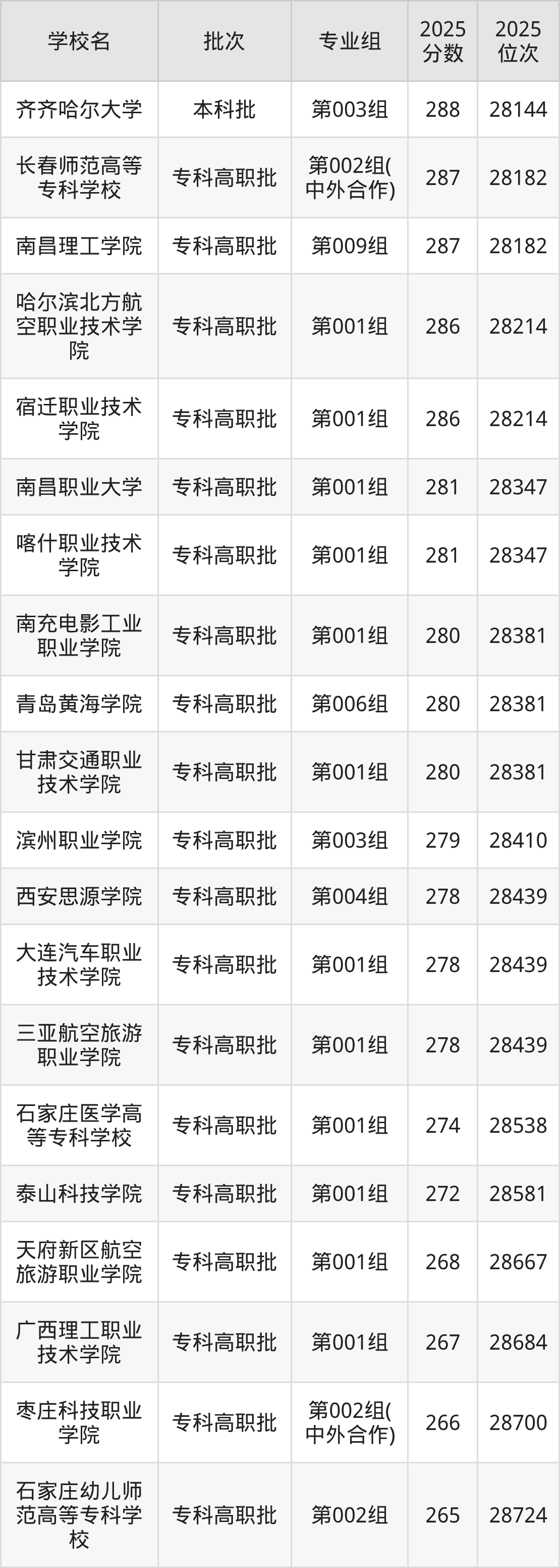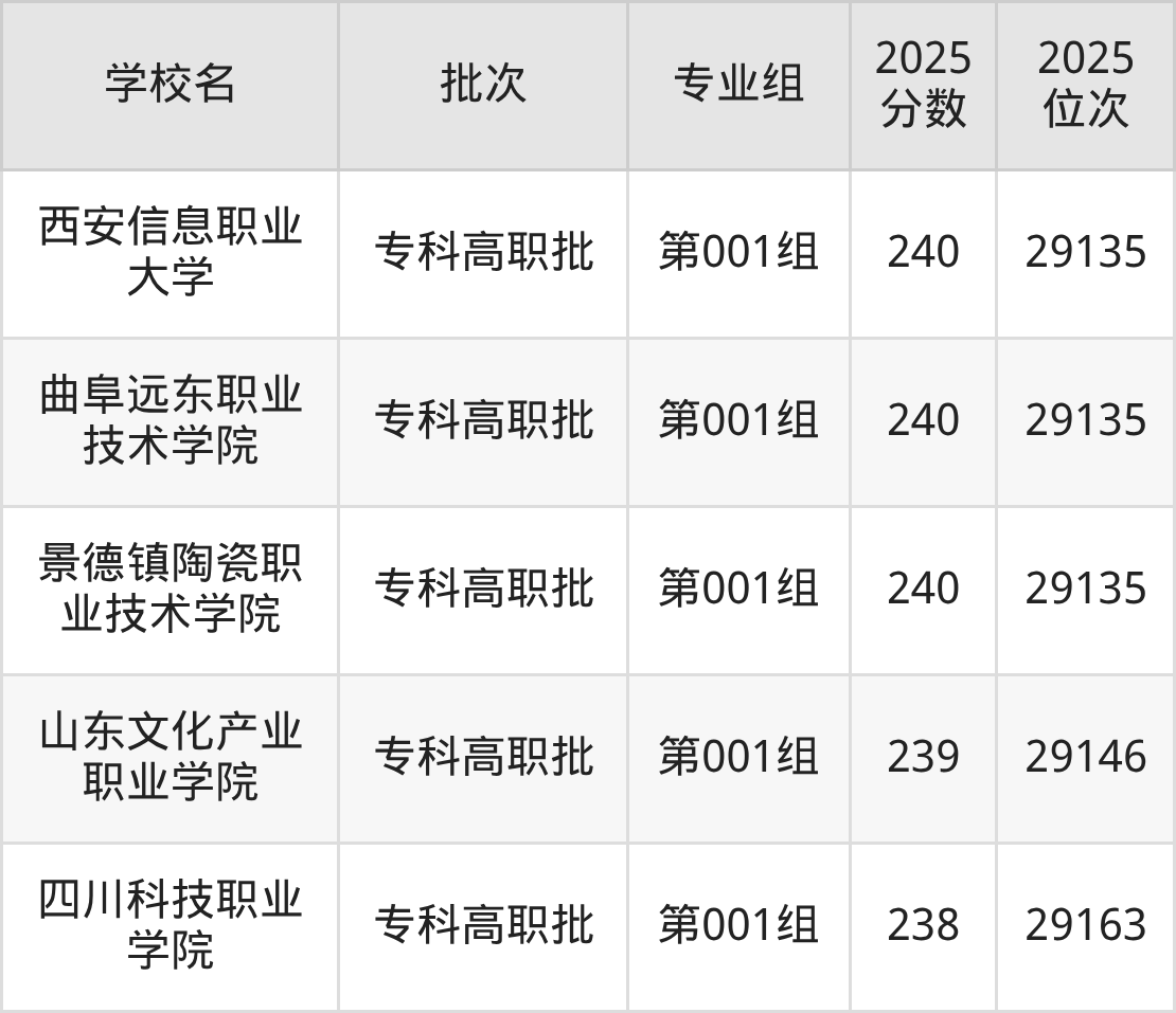 另外录取位次低于该区间(较稳妥)的有广西理工职业技术学院第001组(28684名)、枣庄科技职业学院第002组(中外合作)(28700名)等;录取位次高于该区间(可冲)的有泰山科技学院第001组(28581名)、石家庄医学高等专科学校第001组(28538名)等。