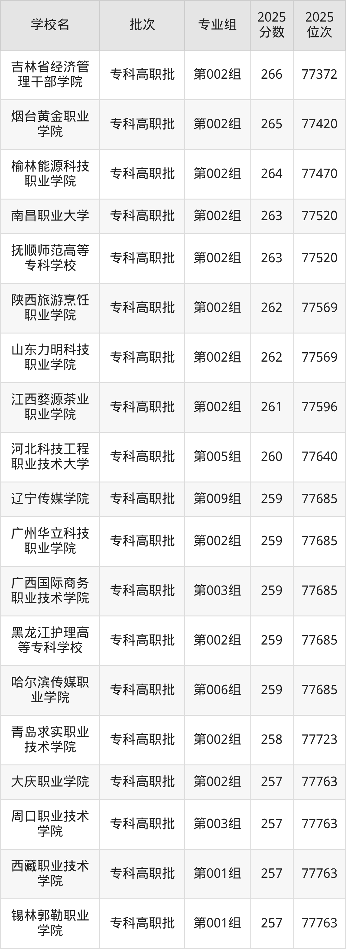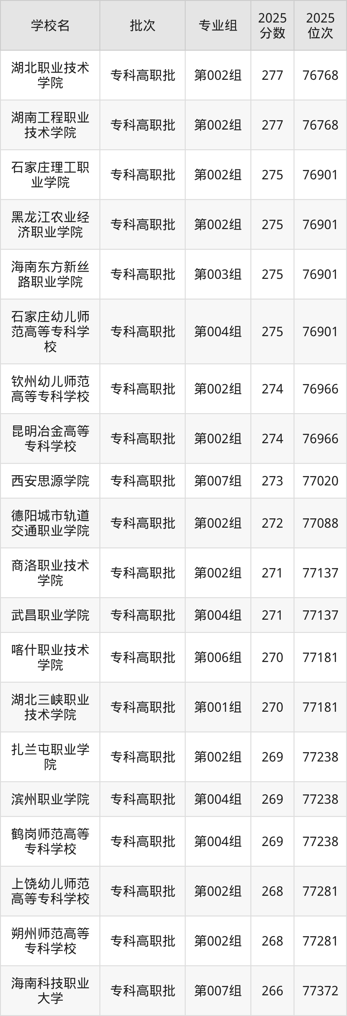 另外录取位次低于该区间(较稳妥)的有海南科技职业大学第007组(77372名)、吉林省经济管理干部学院第002组(77372名)等;录取位次高于该区间(可冲)的有扎兰屯职业学院第002组(77238名)、鹤岗师范高等专科学校第004组(77238名)等。
