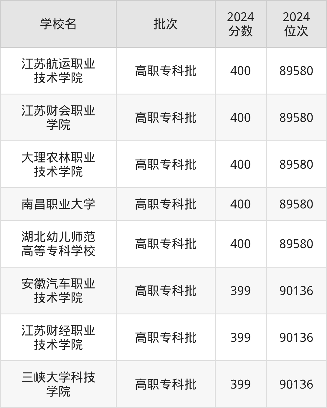 2024年云南高考文科399分(89581名~90136名)能上的大学有安徽汽车职业技术学院、三峡大学科技学院、江苏财经职业技术学院。