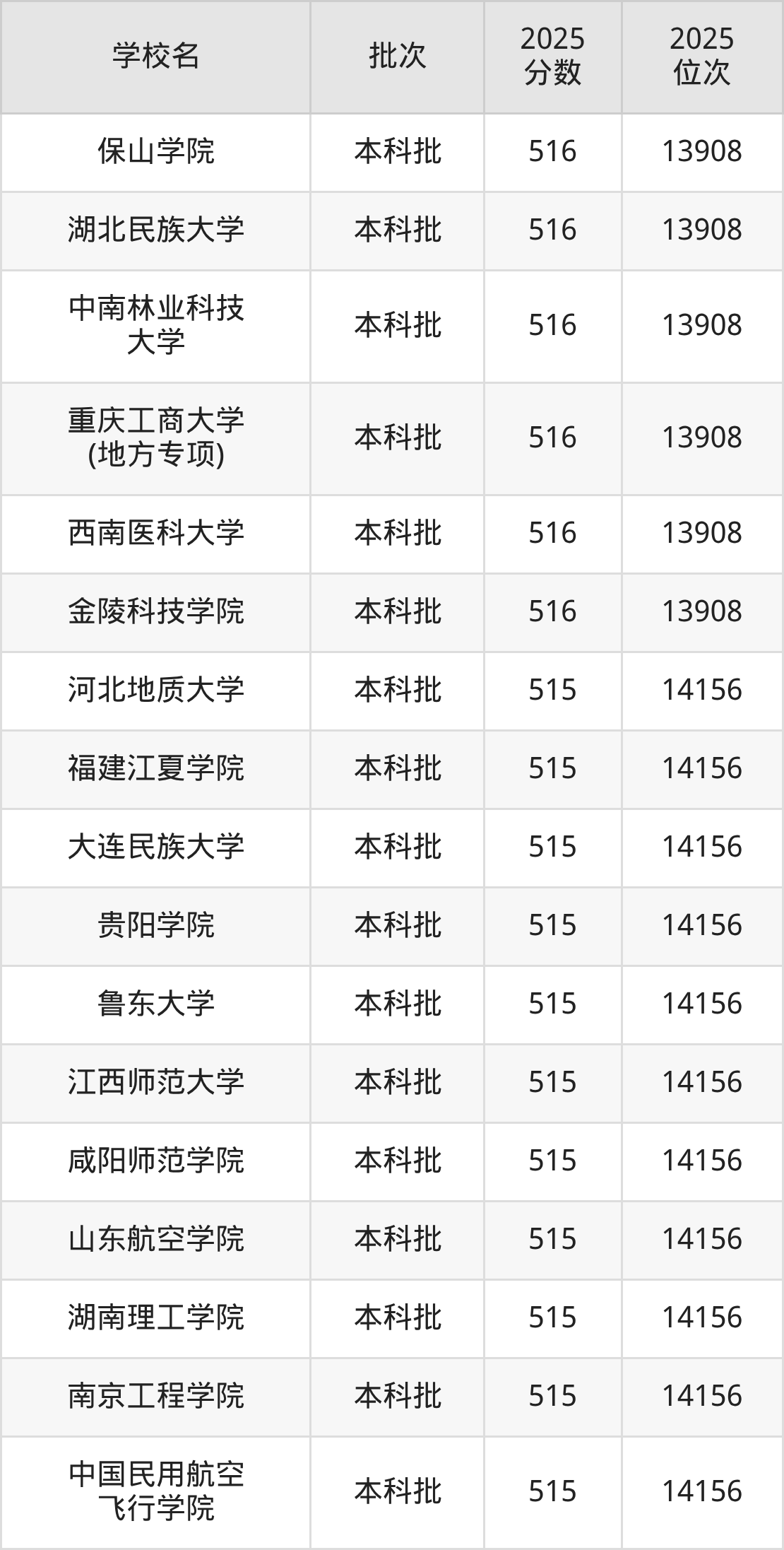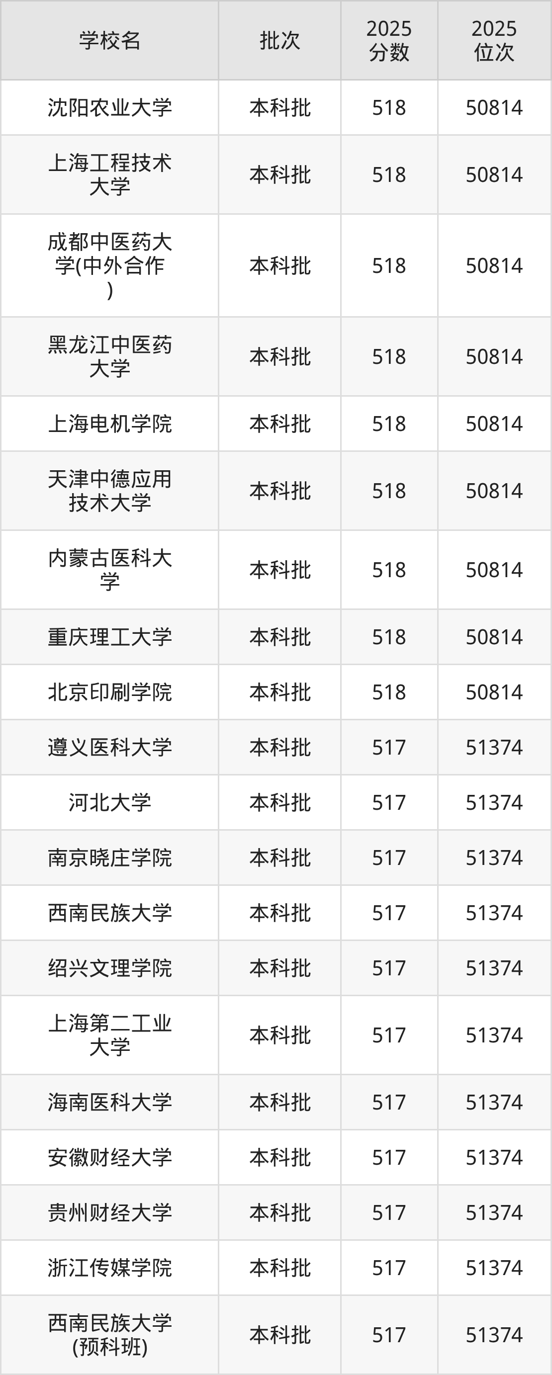 2025年重庆高考物理类517分(50815名~51374名)能上的大学有西南民族大学(预科班)、浙江传媒学院、贵州财经大学、安徽财经大学等。