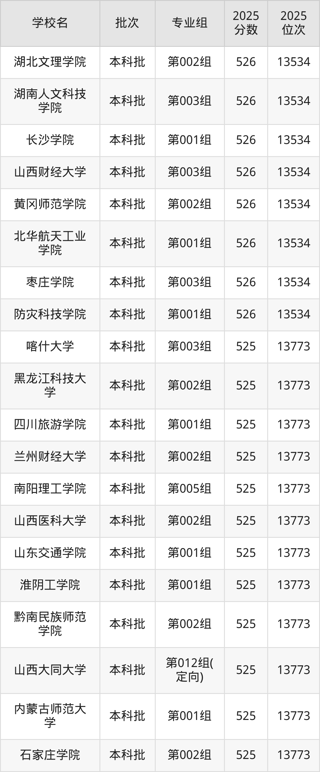 2025年山西高考历史类526分(13289名~13534名)能上的大学有北华航天工业学院第001组、防灾科技学院第001组、枣庄学院第003组、南阳师范学院第003组等。