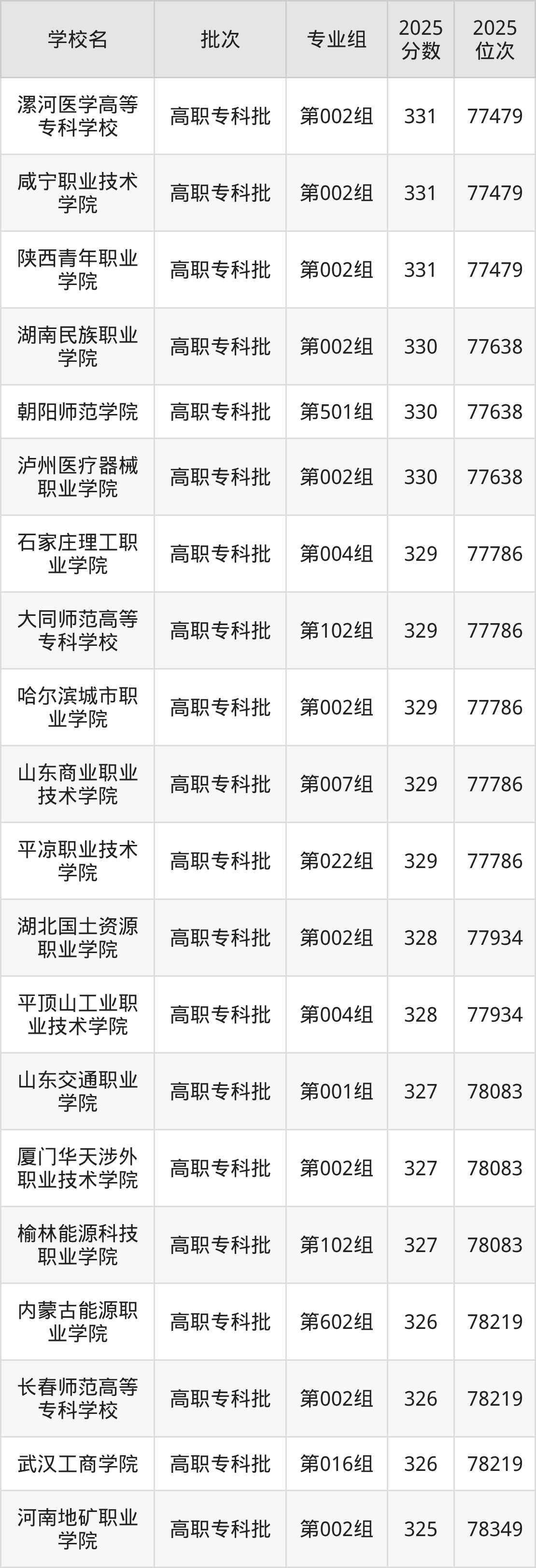 另外录取位次低于该区间(较稳妥)的有内蒙古能源职业学院第602组(78219名)、长春师范高等专科学校第002组(78219名)等;录取位次高于该区间(可冲)的有平顶山工业职业技术学院第004组(77934名)、湖北国土资源职业学院第002组(77934名)等。
